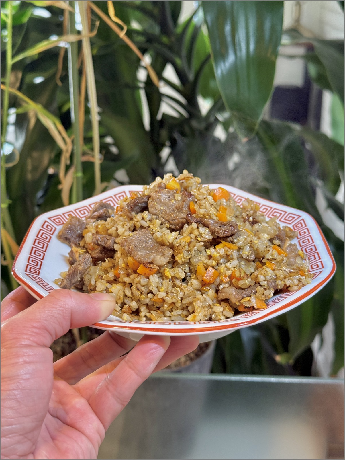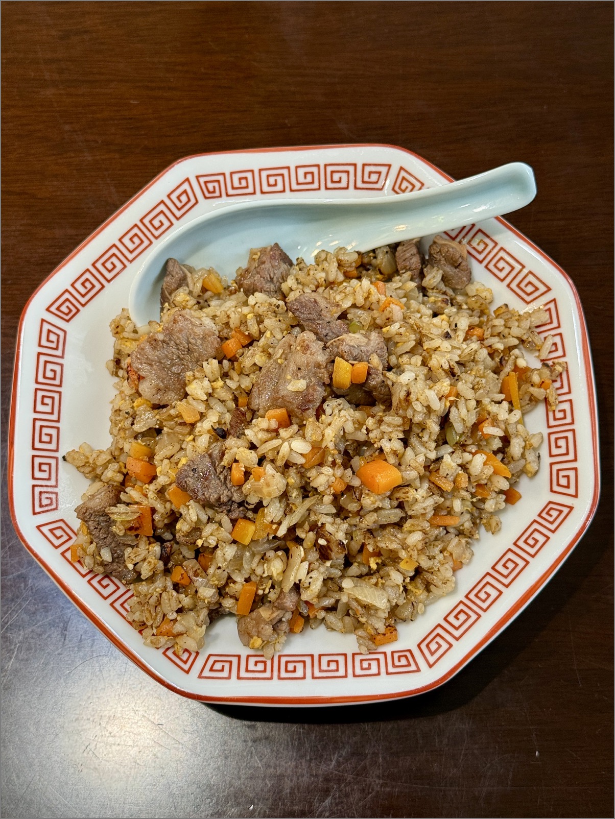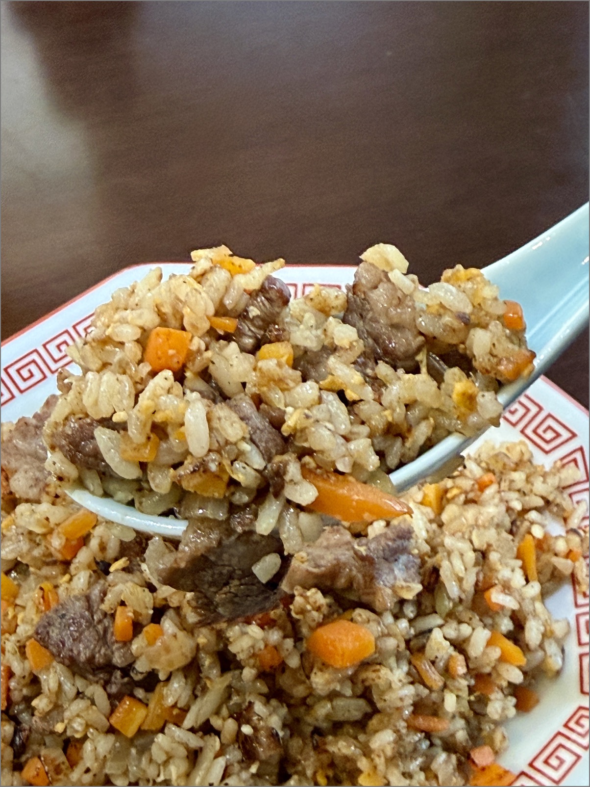 チャーハンというよりは「焼き飯」系な味になっている。それは、牛肉の味付けに醤油を多用したからだと思われるが、牛肉の旨みがダイレクトに伝わるシンプルな味付けで実においしい。