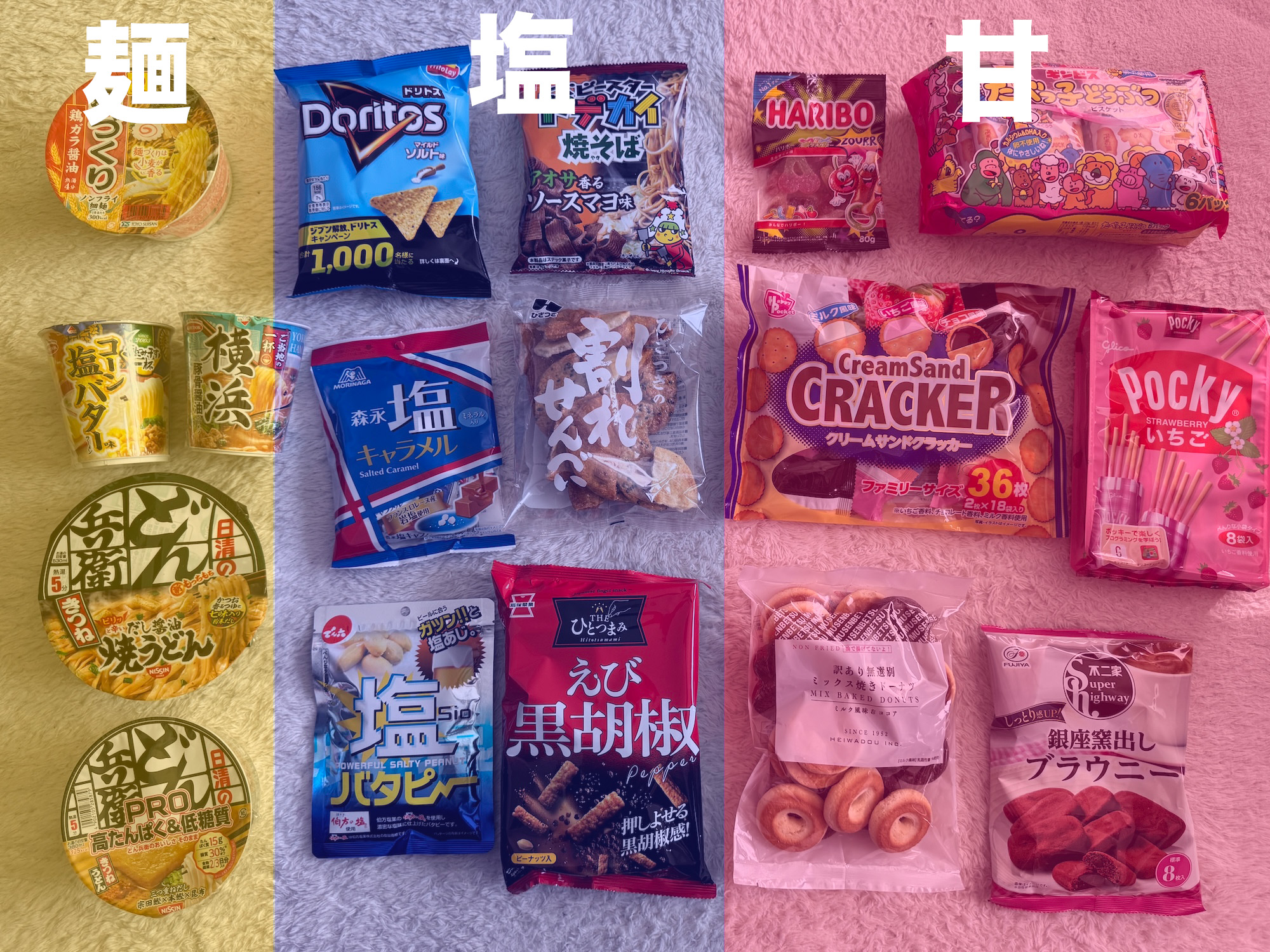 相当お得なハズなのだが、あまりの規則性のなさに、どうコメントするべきか考え込んでしまった。よく見ると『塩キャラメル』『塩バタピー』『ドリトス マイルドソルト味』と、塩シリーズ3部作が揃っているようだ。一旦 “甘いもの” “しょっぱいもの” で分類してみるか。