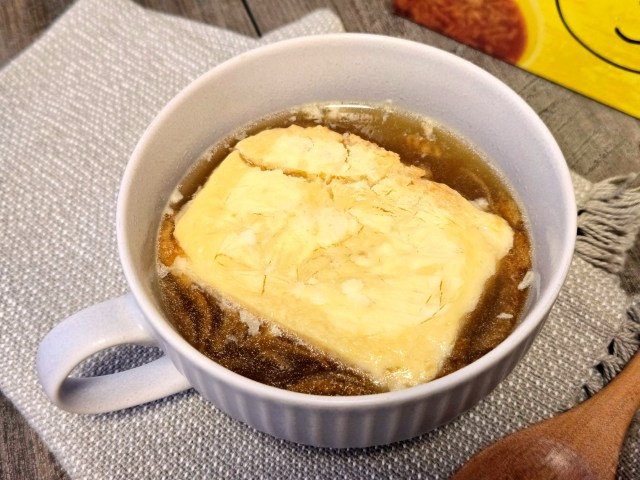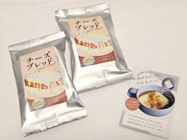 つまり、オニオンスープに入れたら、食べ応えのあるオニオングラタン風のスープに早変わりするのだ! スープを変えればまた違った味が楽しめるとのことで、とてもおもしろい商品だと思う。軽食としてもちょうど良い!
