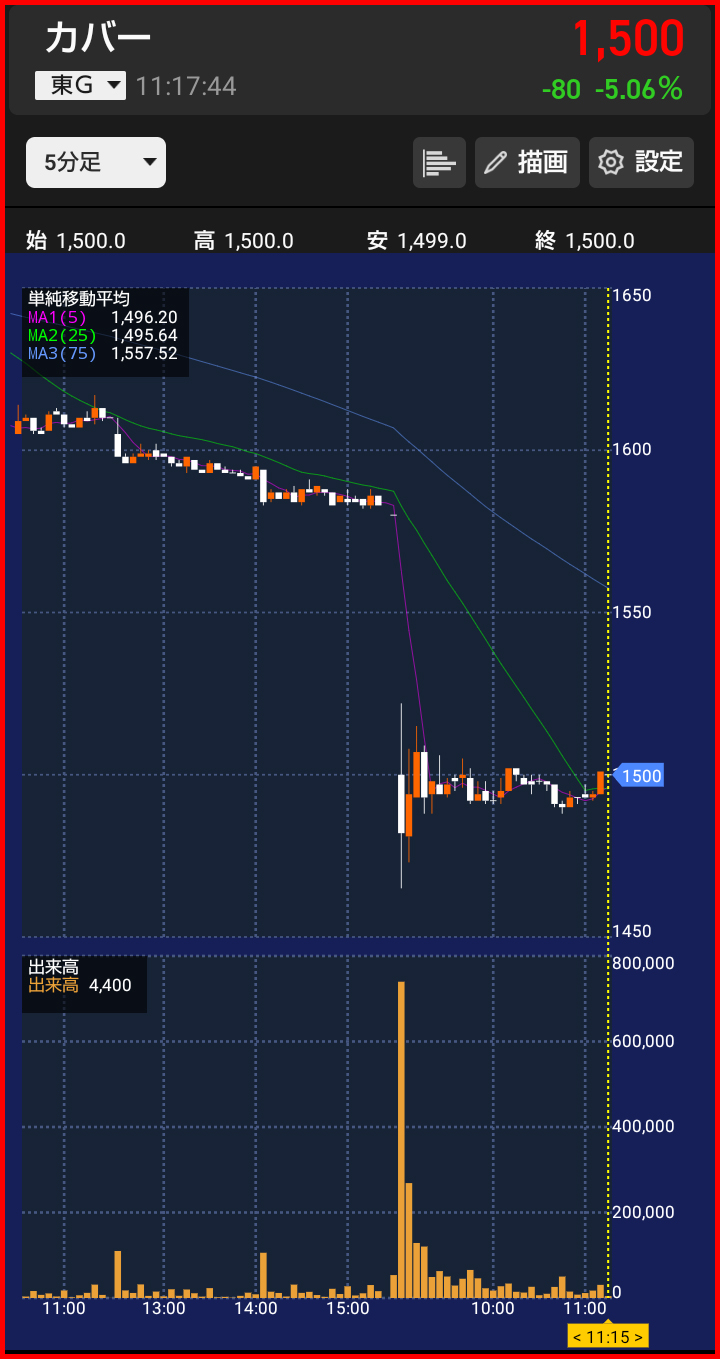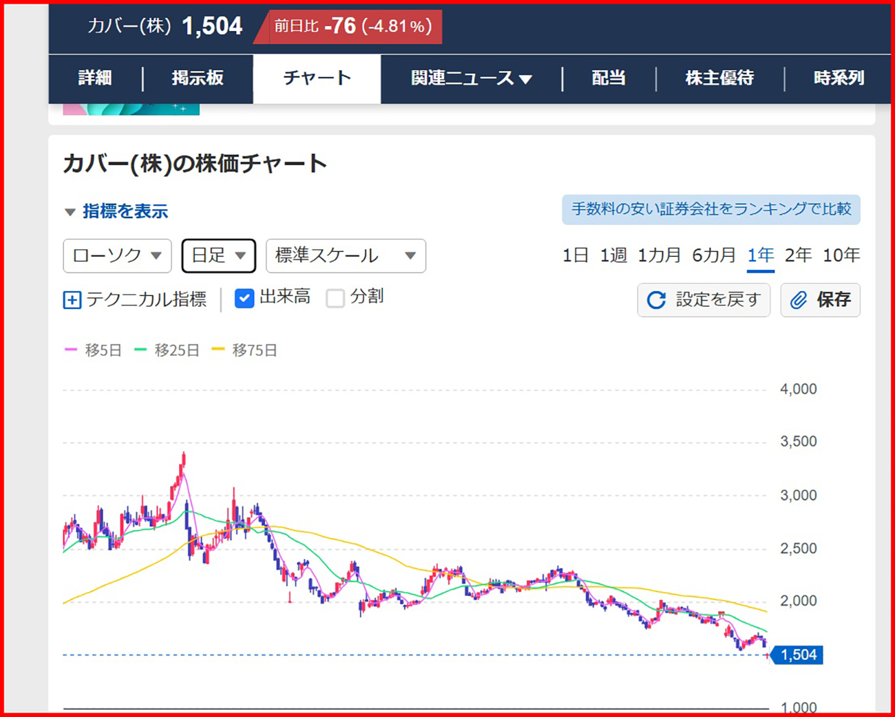 そして、ホロライブ運営会社カバーの株を162万円分購入している私(中澤)は、今朝のカバーの株価も信じられなかった。暴落している! ただでさえこの1年で半分くらいになっていたというのに……!!