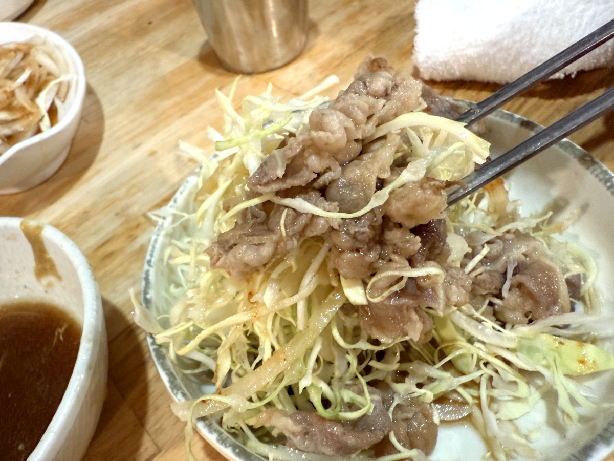 おそらく理由は肉と同時に大量のキャベツを消費しているためで、意外と早めに満腹を迎えてしまったと推測される。肉と同じくらいの量のキャベツを食べていれば、そりゃ腹も早めに満ちる。