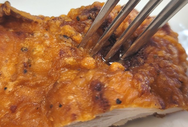 ザクザクと心地良い荒々しさとともに衣が破けるや、ソフトな弾力をたたえた上もも肉が露出し、ジューシーな肉汁があふれる。自然と顔が綻ぶ。美味としか言いようがない。