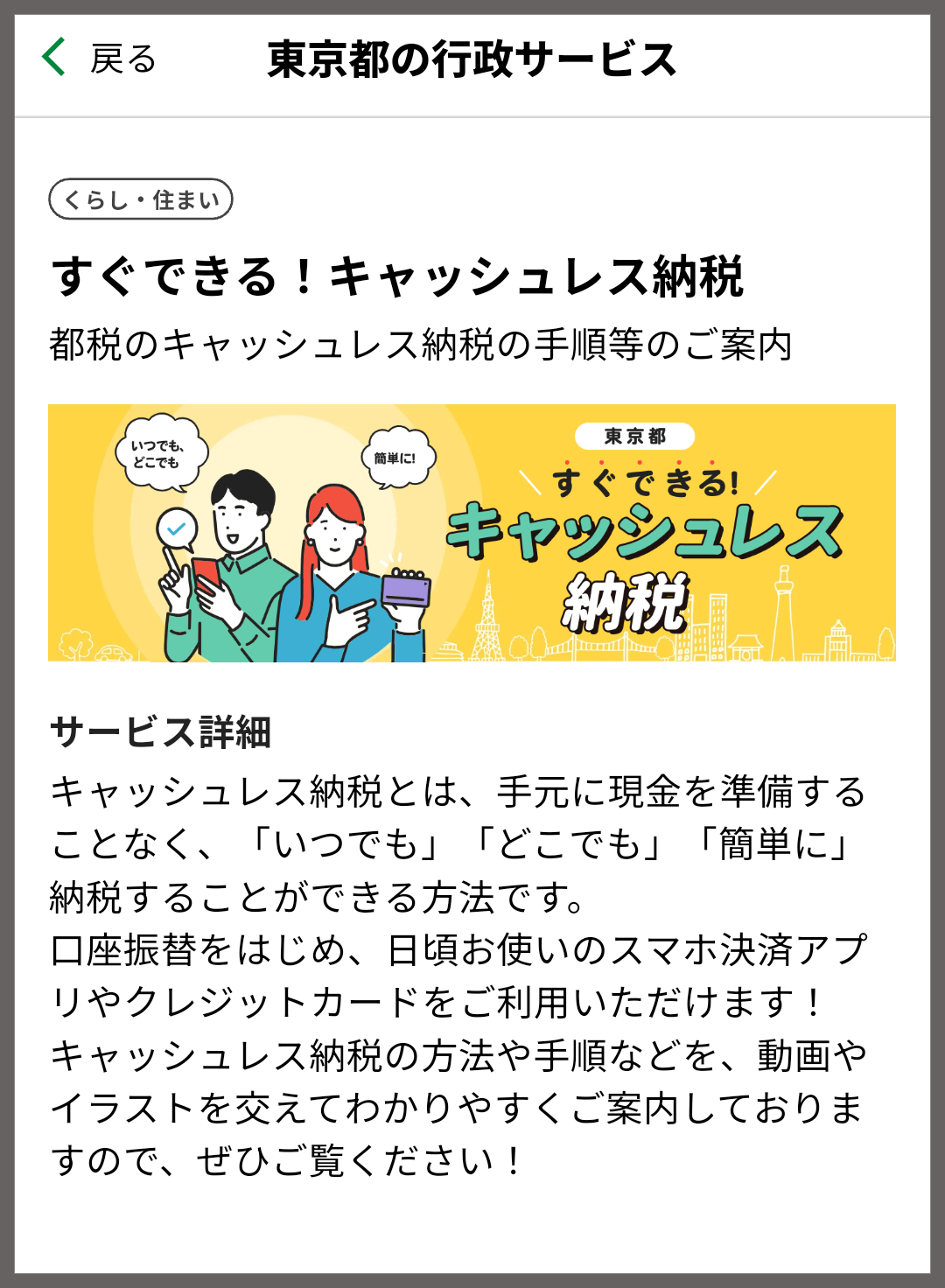 現在は行政サービスの項目を開いて「サービスを開く」の項目をタップすると、ブラウザが開いて各種サイトに遷移してしまう。たとえば「すぐできる! キャッシュレス納税」という項目を見ると……。