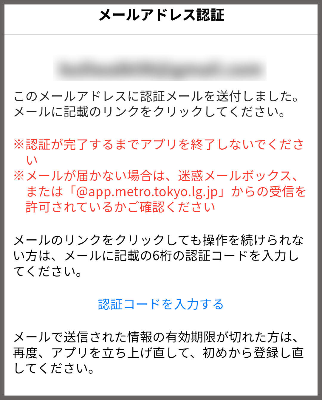 アドレスに認証コードが送られるので、その6桁の数字を入力する。