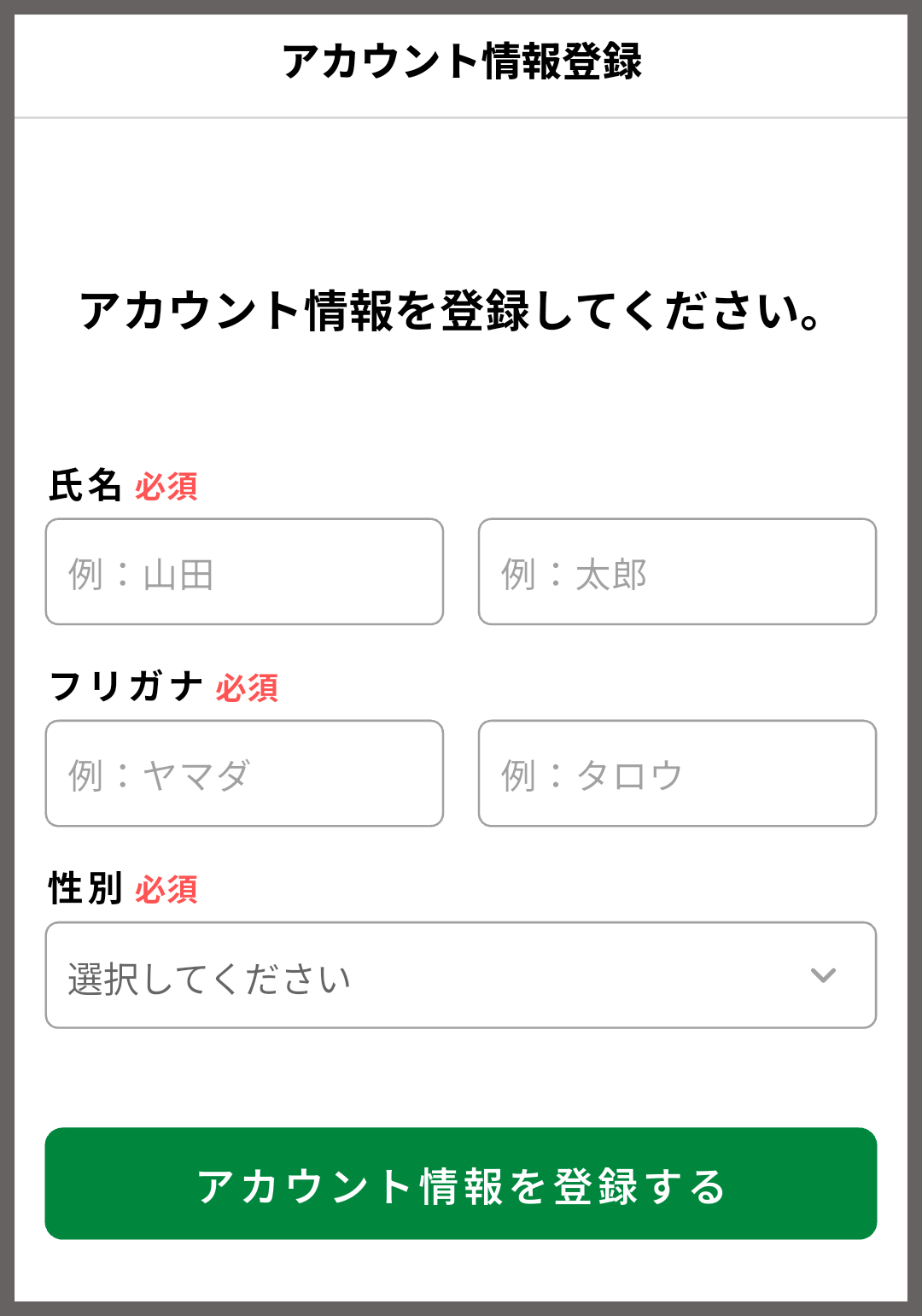電話番号の認証が完了すると、アカウント情報として名前と性別を登録する。