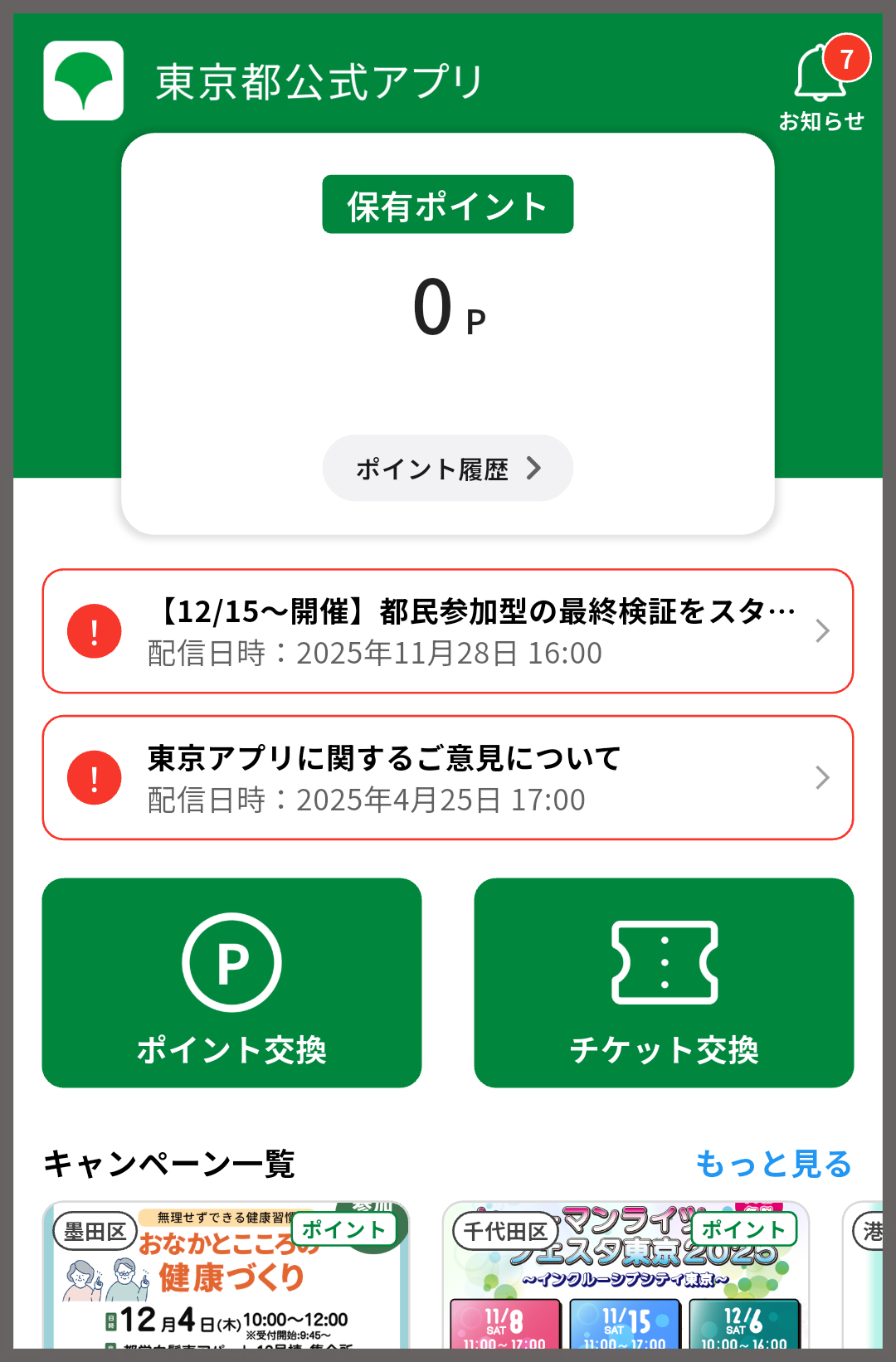 そうしてようやくアプリを利用可能となる。ホーム画面上部には保有ポイントが表示されている。お知らせの下に「ポイント交換と「チケット交換」のボタンが表示されている。獲得したポイントは民間サービスのポイントや、都立施設等のチケットに交換することが可能だ。