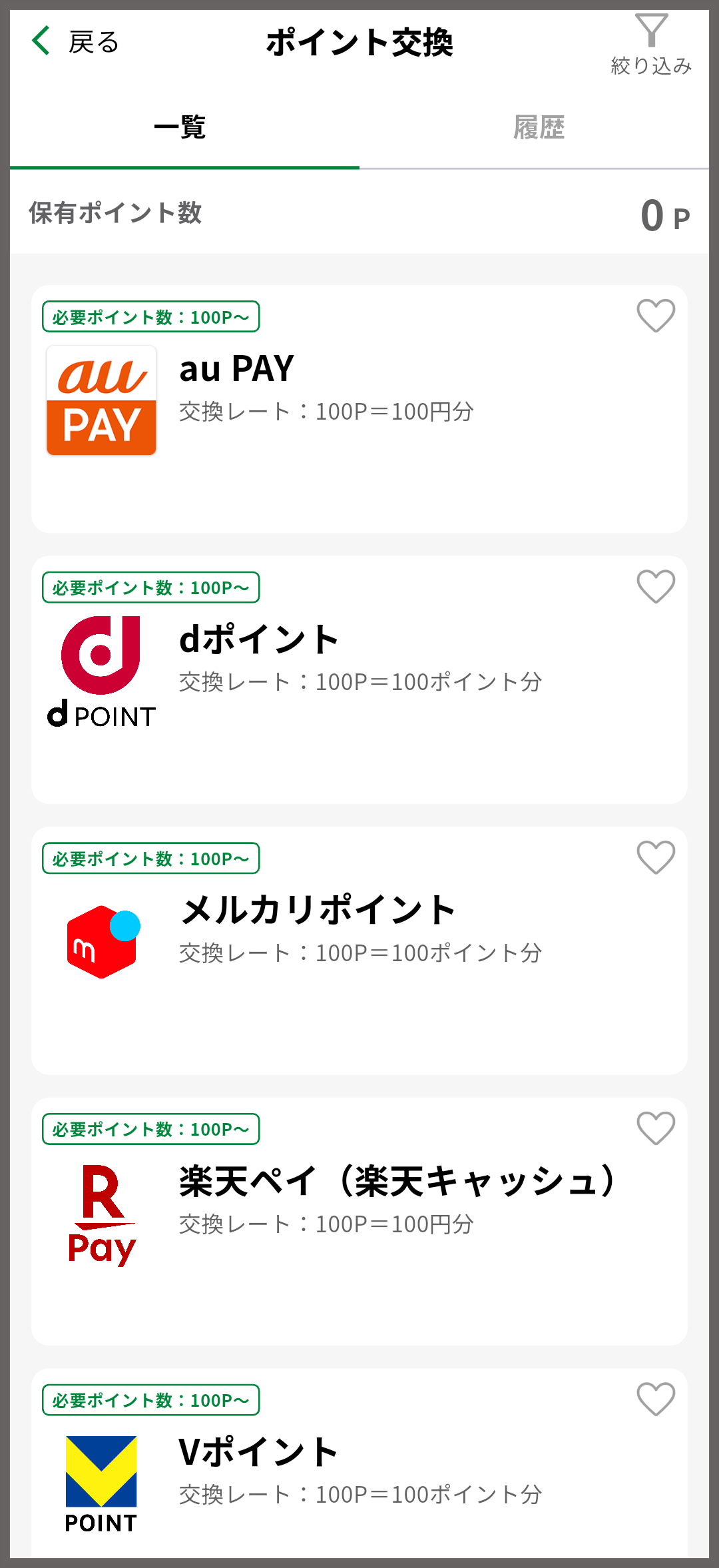 交換できるサービスは現段階(2025年12月3日)で「au Pay」「dポイント」「メルカリポイント」「楽天キャッシュ(楽天ペイ)」「Vポイント」である。