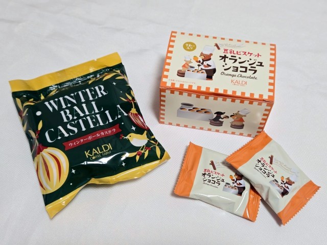 中身をくわしく見ていこう。お菓子系はカルディで人気の豆乳ビスケットの新味「オランジュショコラ」と、ドライフルーツが練り込まれた「ウィンターボールカステラ」が入っていて、