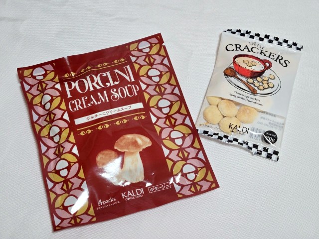 しょっぱい系として、「ポルチーニクリームスープ」と、スープとも相性が良い「プチクラッカー」がセットになっていた。