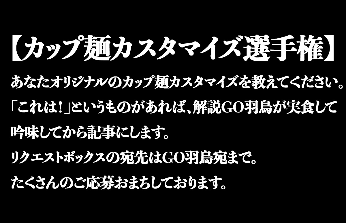 ──というわけで、我こそは! というカップ麺カスタマイズを秘めている人は、是非ともリクエストボックスに送ってください。たくさんの応募をお待ちしております。それではまた!