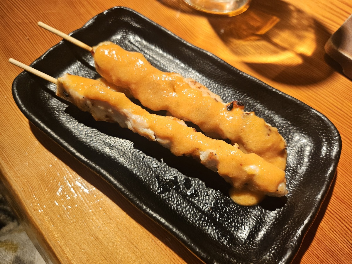 最初に届いた「むね明太マヨ焼」は、個人的には鉄板メニュー。私は大の明太子好きなのだが、ここに来たら必ず頼むほどの存在だ。むね肉の淡白さに明太マヨのこってりが絡んで、お酒が進む一品。