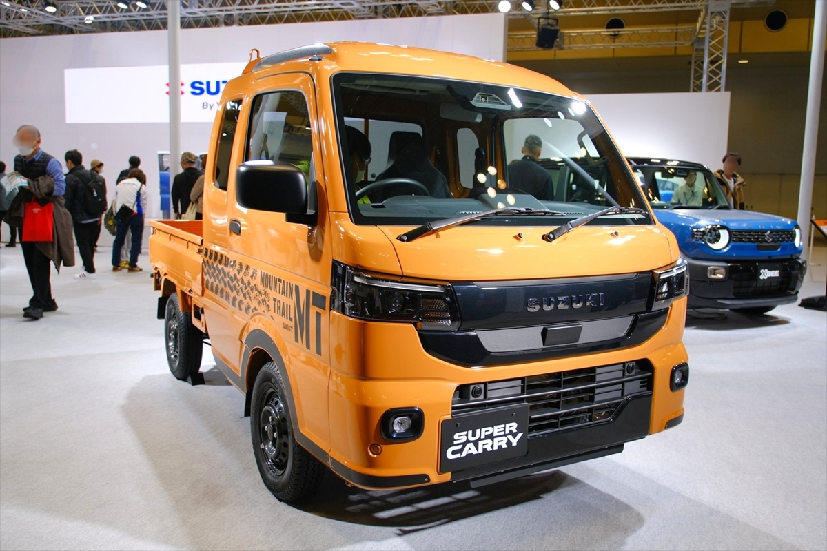 ▼スズキ『スーパーキャリイ Xリミテッド』。フルモデルチェンジをしたばかりの新型車。座席の後ろに収納スペースが作られ、シートのスライド量やリクライニング角度が広くなっている。特別仕様車の専用デカールがカッコいい!