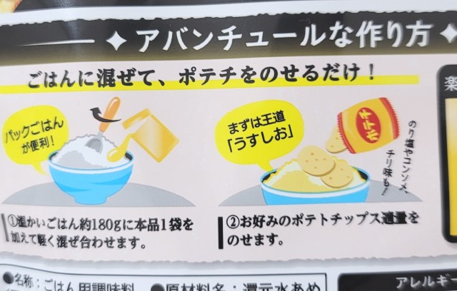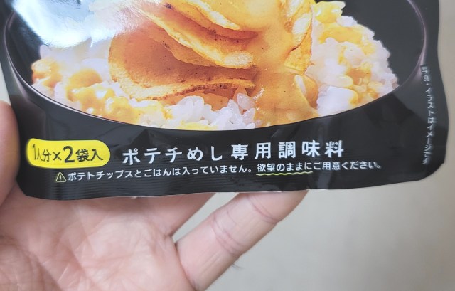 本商品には1人分の調味料が2袋入っており、パッケージ裏の説明文曰く、調味料1袋と温かいご飯180グラム(パックご飯約1個分)を軽く混ぜ合わせ、その上にポテトチップスを乗せれば「ポテチめし」の出来上がりとのことである。