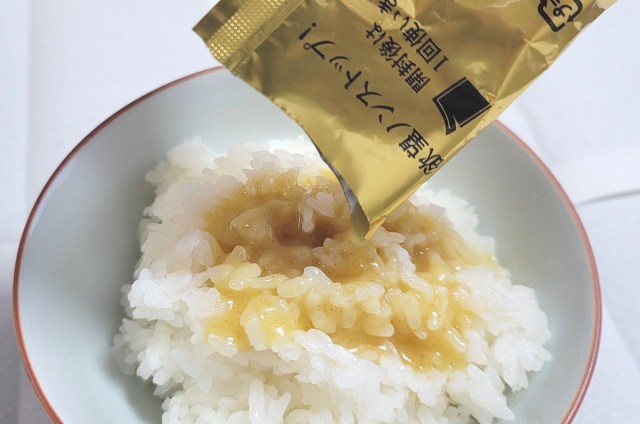というわけで、言われた通りに白米を茶碗に盛り、まずは「ガーリックバター風味」の調味料の方から混ぜ込んでいく。