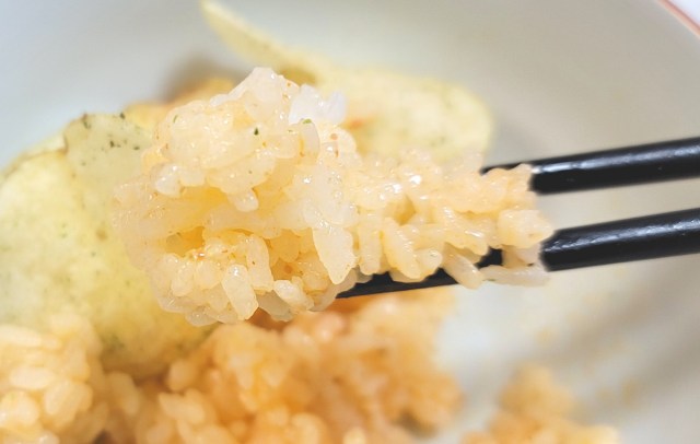 ともあれ実際に出来上がった「ポテチめし」の見た目は、予想以上にどのジャンルの料理にも属しておらず、好奇心を刺激してやまなかった。加えて、一口頬張った時の味わいはさらに一層、予想を裏切るにもほどがあるものだった。