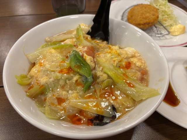 「トマト酸辣湯麺」はドラマ「サ道」でも紹介されたセンターを代表するサウナ飯。小盛りでも十分なほどのボリューム。豆腐にレタスにトマト、キクラゲにピーマンなど野菜たっぷりですっぱ辛くて最高!