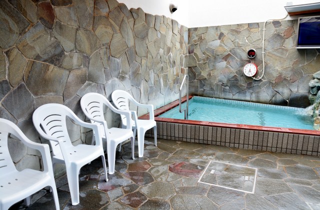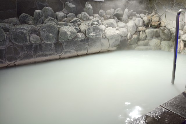 そして、マダムたちに愛されているのが露天にある草津の湯。白い湯船に濃い硫黄の香りがたまらない。草津の湯といえば美肌で有名。30分ごとに草津の源泉の液が流れてくるのだが、その時間になるとマダムたちがワラワラ寄ってくるので圧巻。