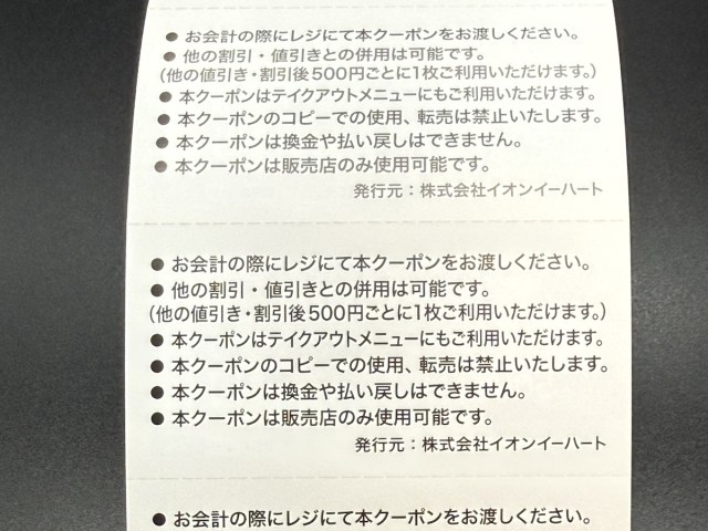 (金券ではなく)割引券なので、使用にはルールがある。会計税込500円ごとに1枚使用可で100円引き。