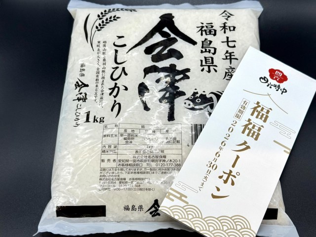 嬉しいのが「令和7年産 会津こしひかり」! 1kg(1000円相当)がもれなく入っている。