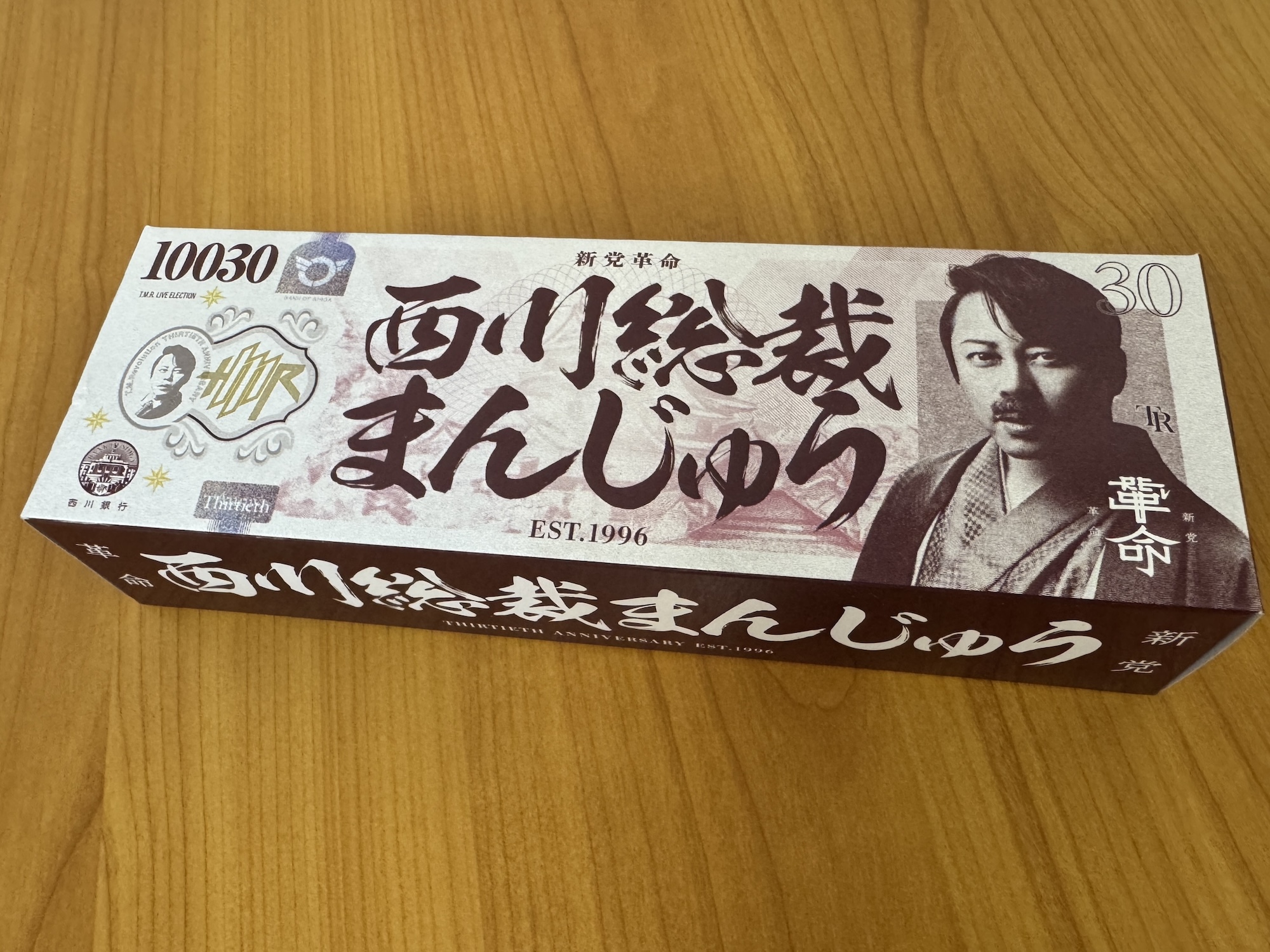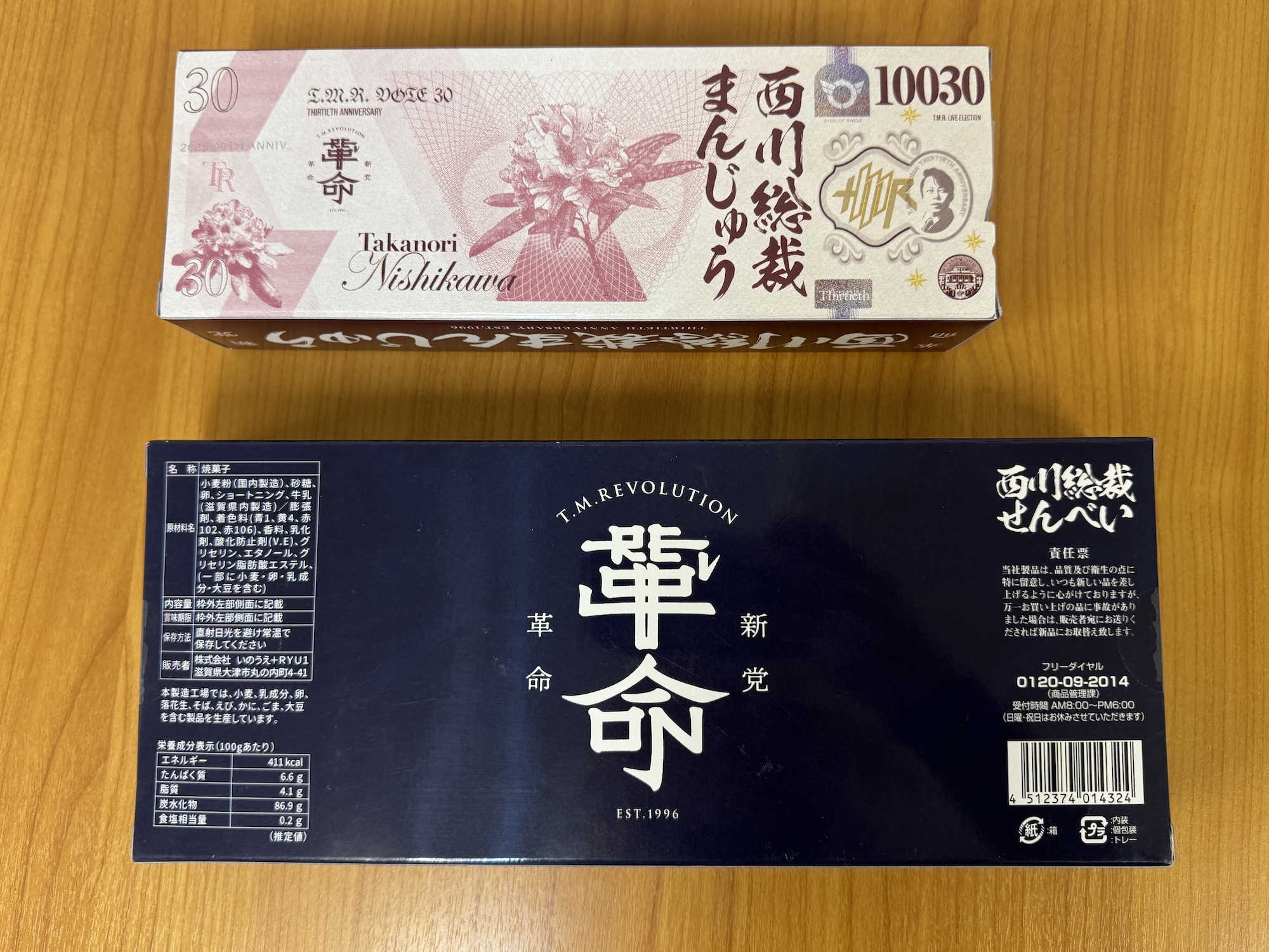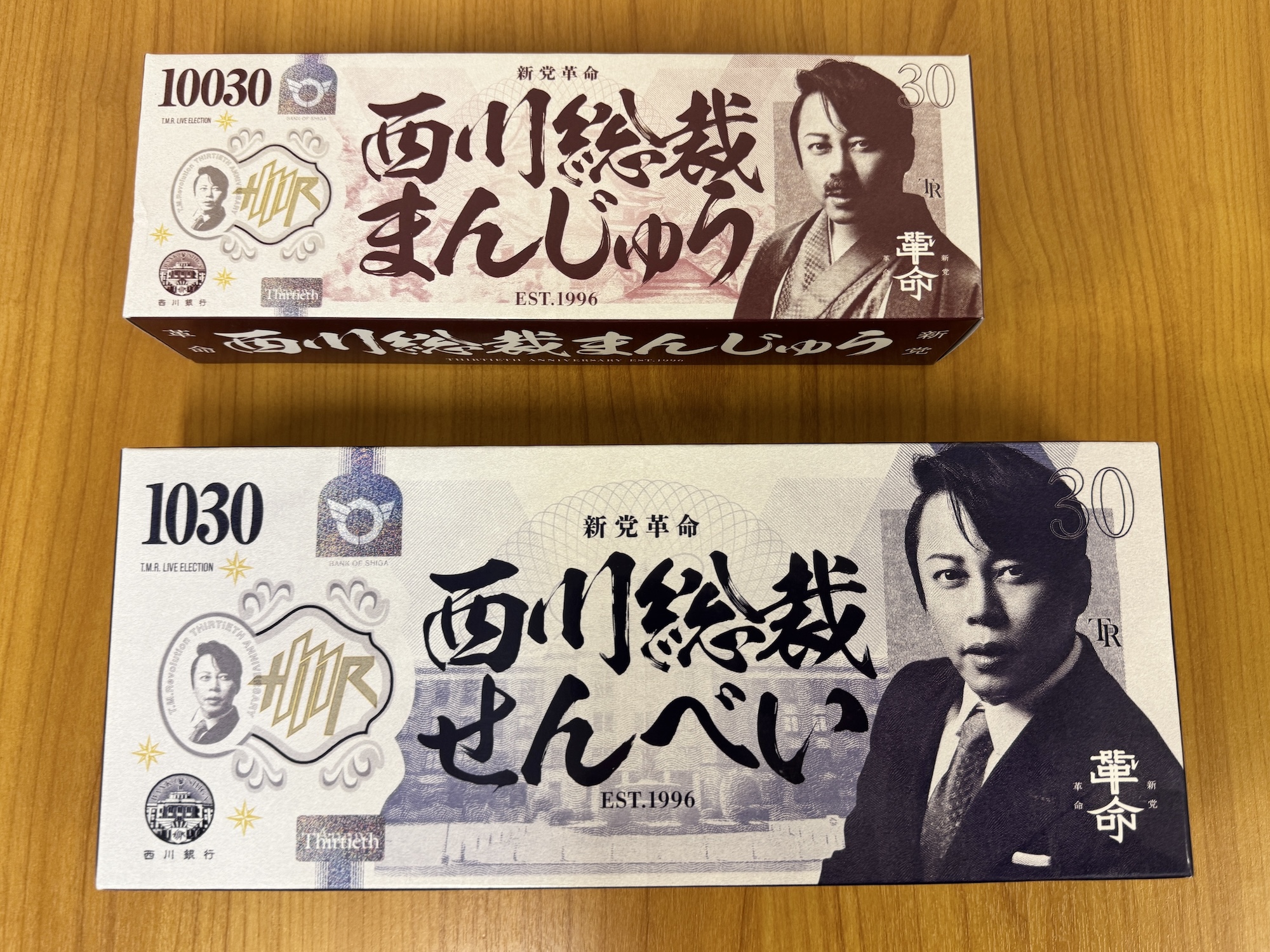 それからパッケージに記載された「30」の数字は、西川さんの「デビュー30周年」を示すものらしい。そもそも総裁まんじゅう&せんべいは、西川さんの全国ツアー「T.M.R.LIVE ELECTION-VOTE30-」の開催を記念して発売されたものなのだそう。