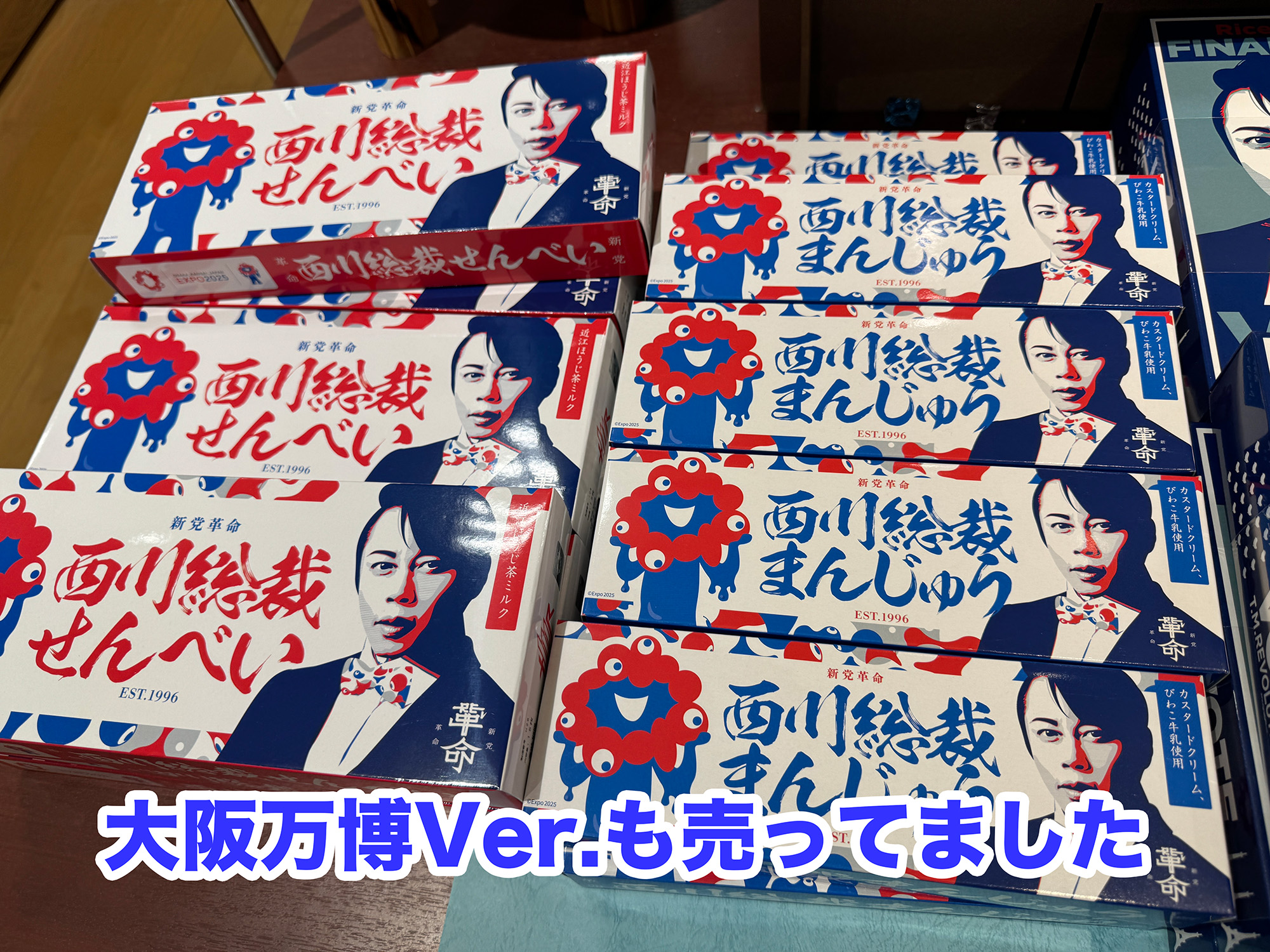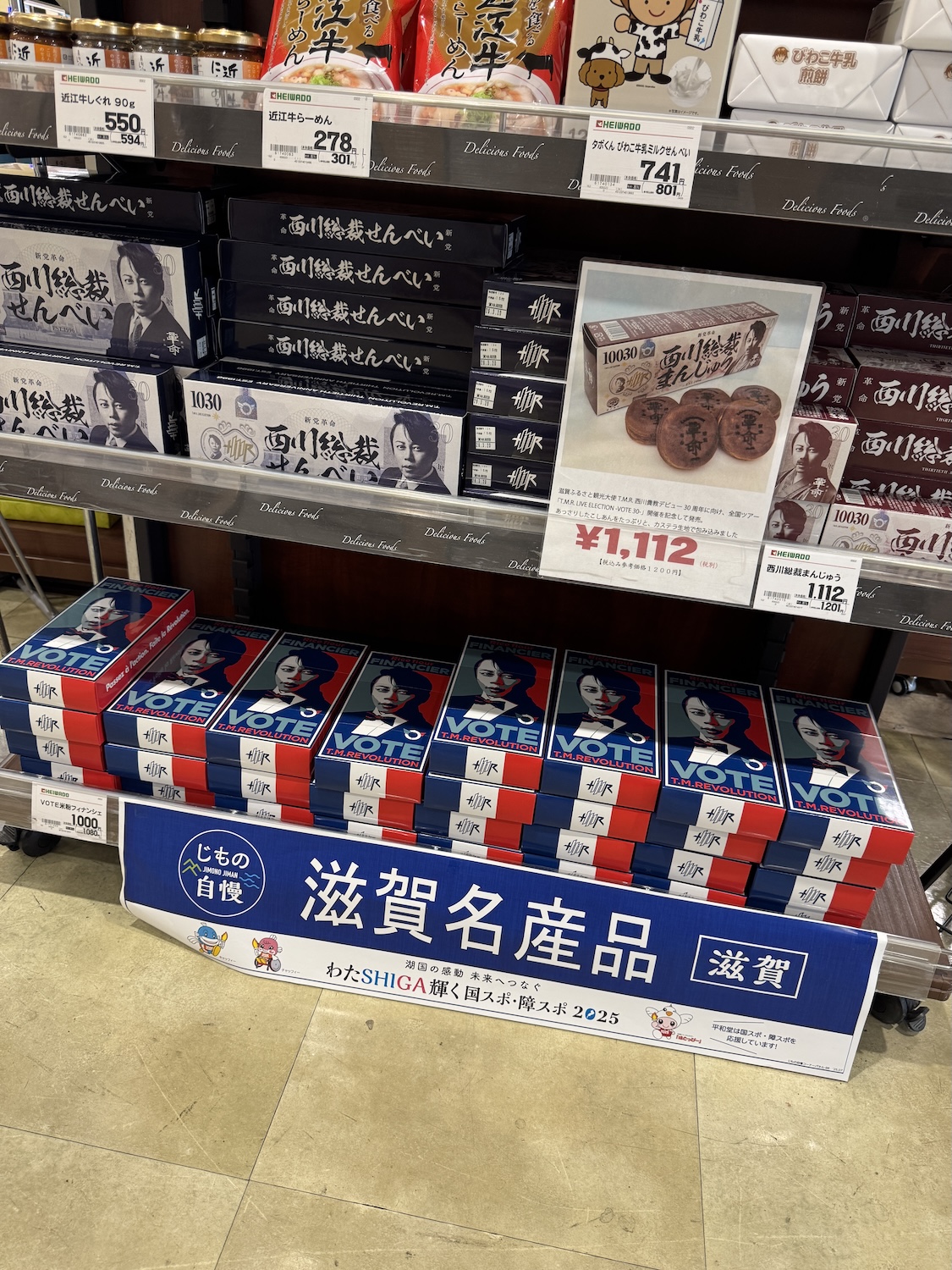 なお同じく西川さんの顔面がデザインされたお菓子『VOTE』シリーズは以前からあった。『西川総裁』シリーズに関しては、同行していた滋賀在住の友人も「初めて見た」と言っていたので、最近発売されたものとみて間違いない。