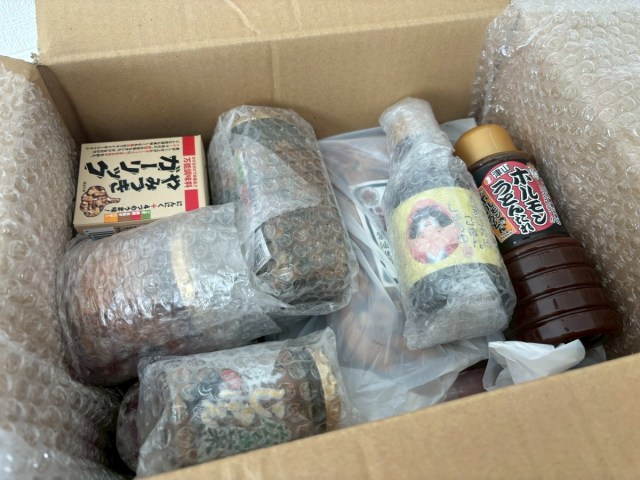 中身は予想どおり、瓶商品が中心で、ひとつひとつ丁寧に梱包されていた。では、一気に並べてみよう。