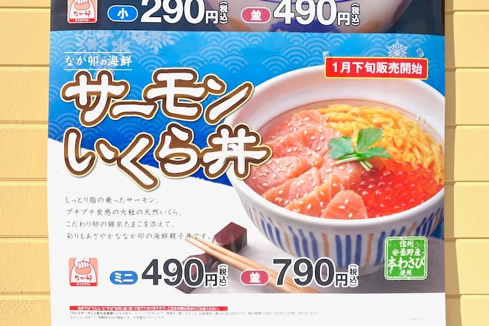 2025年12月10日より全国のなか卯に「サーモン丼(920円)」が登場している。と同時にサーモン丼の上位互換『サーモンいくら丼(1580円)』も発売中だ。