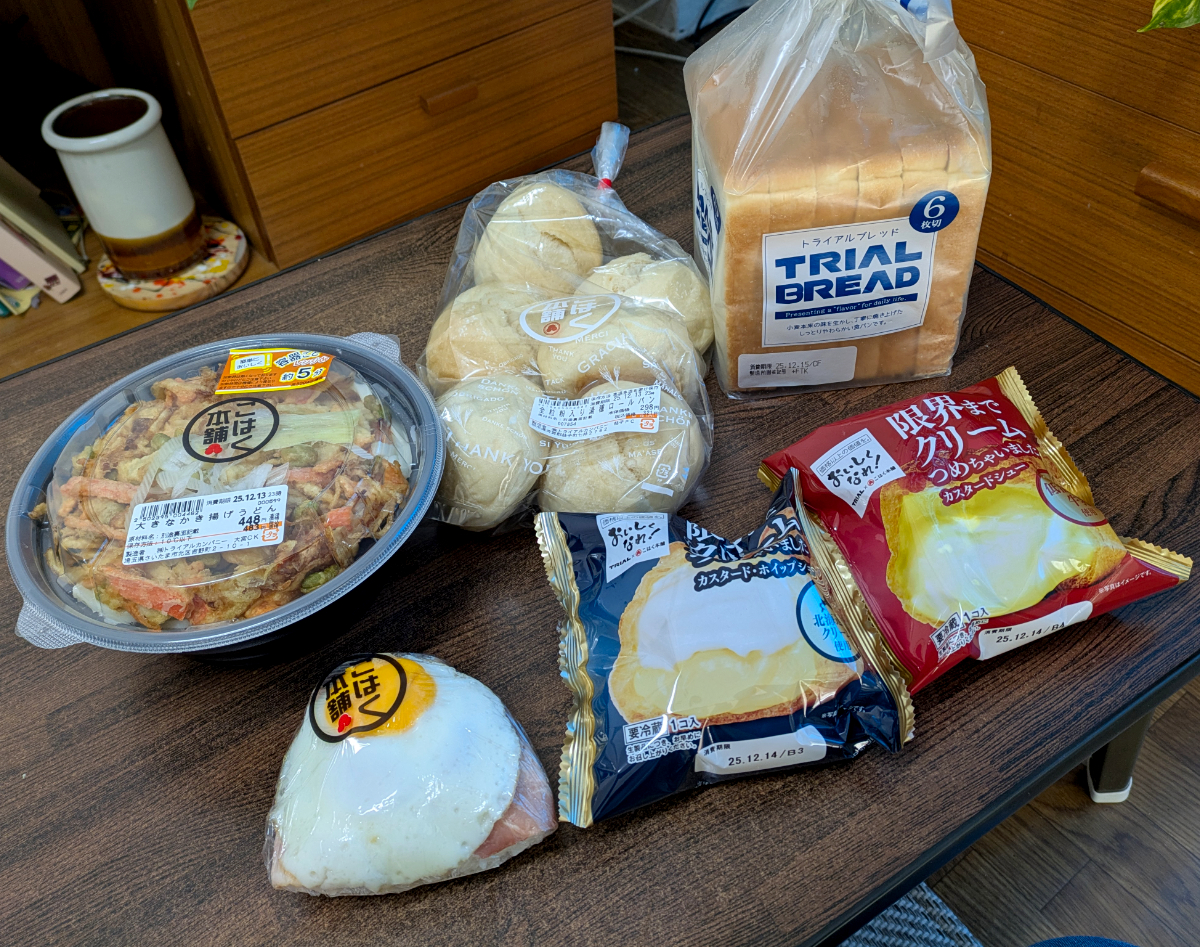 さて、今回購入したのは全6品。トライアルブレッド(6枚:税別98円)・全粒粉入り湯種ロールパン(6個:税別298円)・大きなかき揚げうどん(税別448円)・ベーコンエッグおにぎり(税別208円)・限界までクリームつめちゃいましたカスタードホイップ(税別99円)・限界までクリームつめちゃいましたカスタード(税別99円)である。