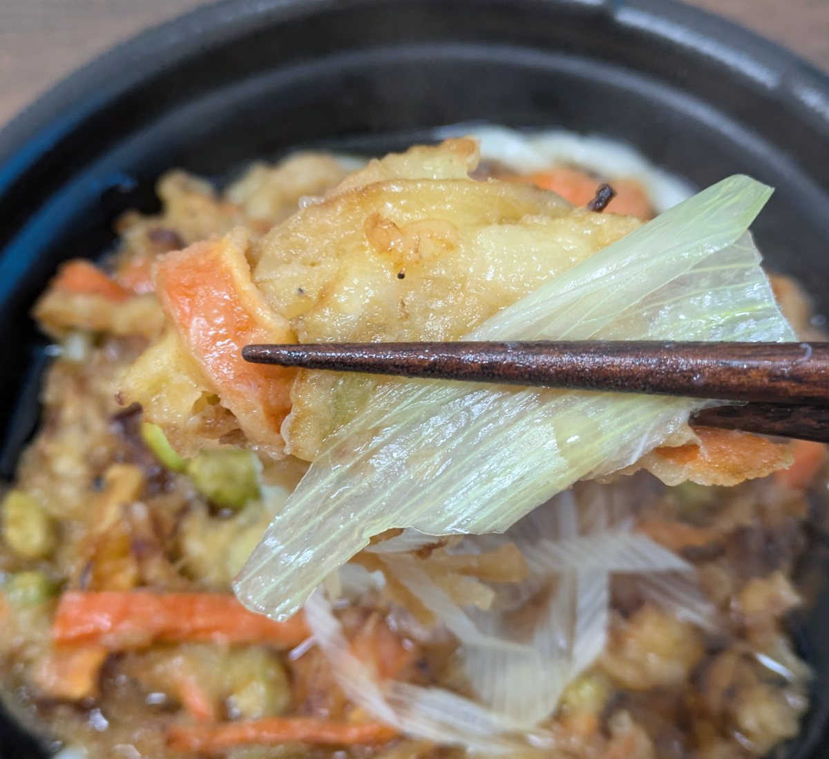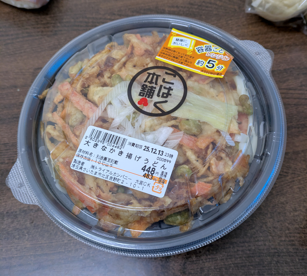 では実際に、レンチン5分の大きなかき揚げうどんを食べてみると、サクサクかき揚げと思いきや、ふにゃふにゃかき揚げでちょっとガッカリ……。