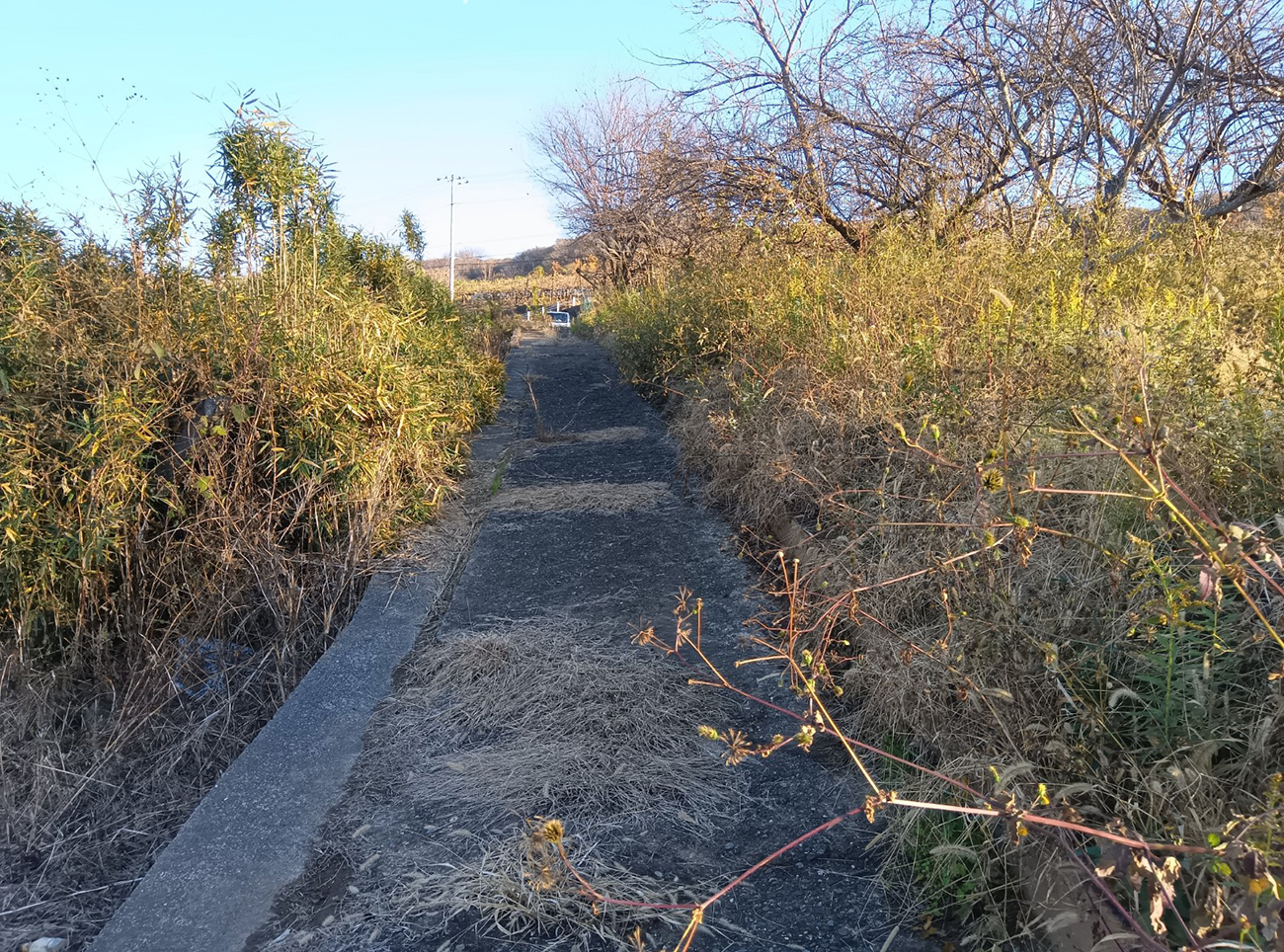 道も気づいたら雑草がアスファルトを突き破る野生のパワーを感じるものに。もうすぐのはずだけど、相変わらず温泉の気配はない。っていうか、本当にこの先に温泉はあるんだろうか。Googleマップくん嘘ついてない?