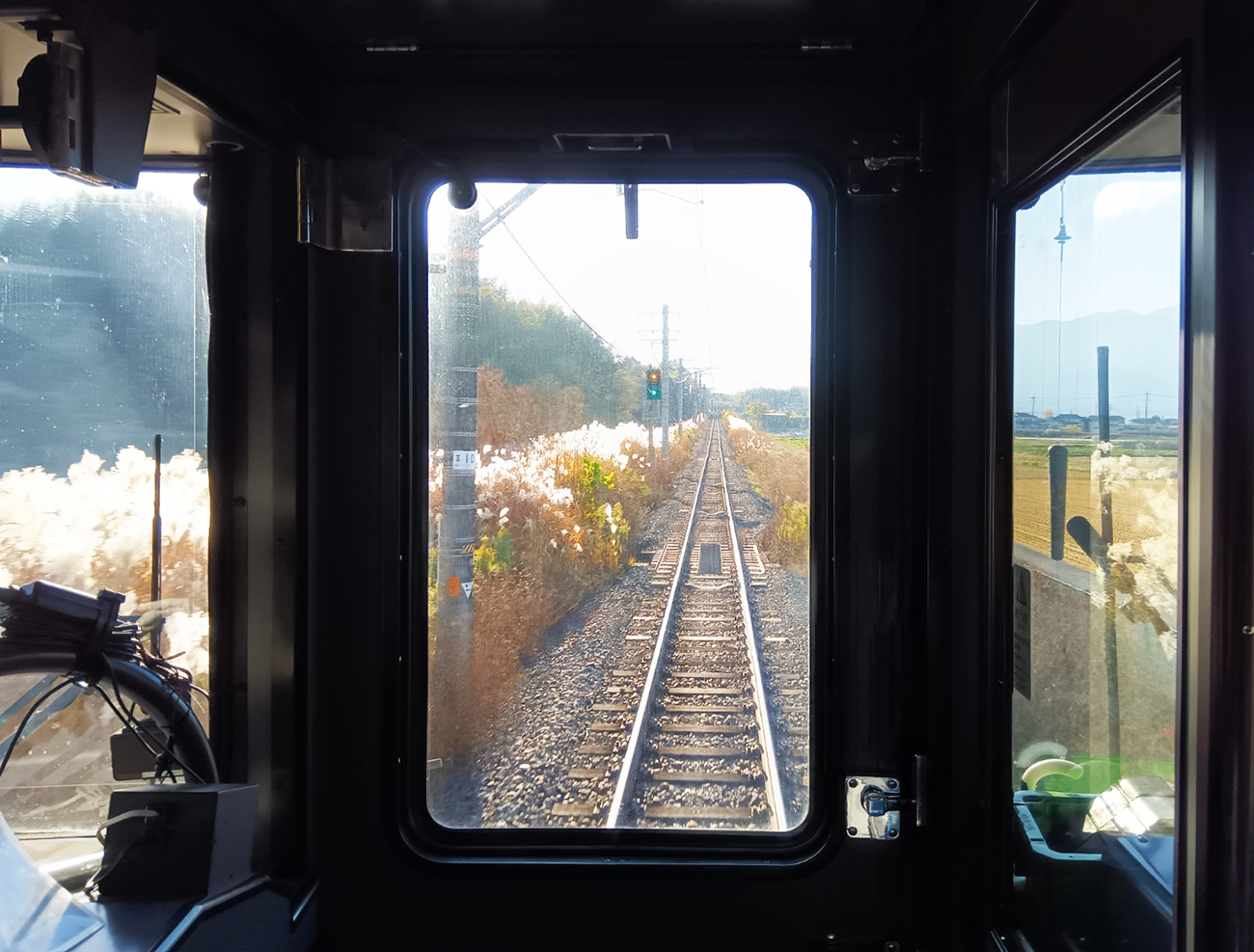 甲府から海に向かって南下していく身延線。甲斐上野駅は山間に突入する直前の山際にあたるので、駅到着前の景色は窓に甲府盆地が開けていた。おまけに、輝くような線路脇のススキが幻想的な雰囲気を醸し出している。