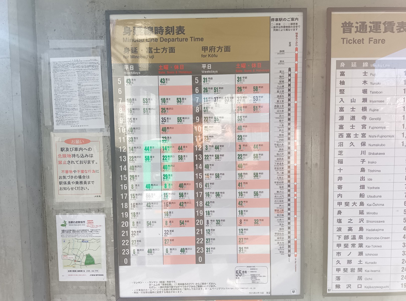 ▼甲府方面の終電は結構遅くまであるけど、甲府から新宿への特急あずさの最終は21時台なので、日帰りだと特急あずさを軸に考えると良いかも