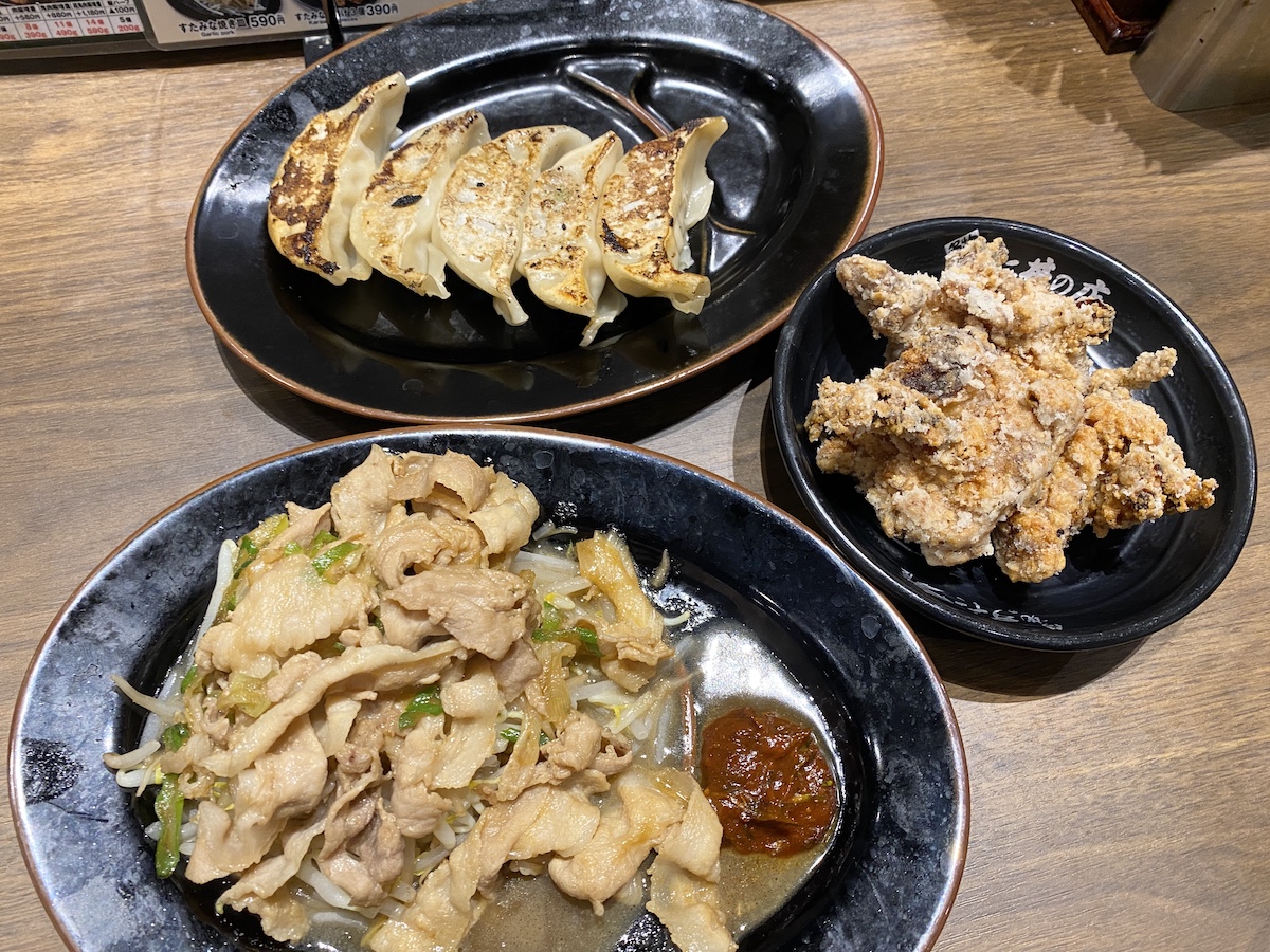 唐揚げはごつめの皮で食べ応えあってジューシー。餃子も皮もっちりの肉汁系で圧倒的にビールが進む。