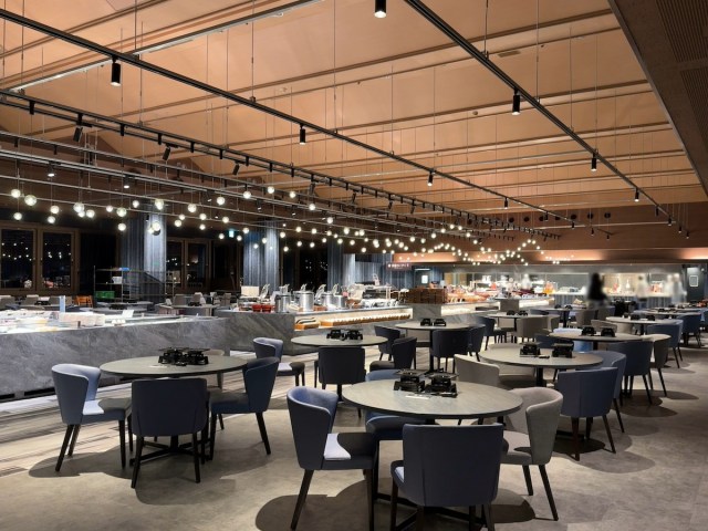 館内紹介も温泉も後回し、とにかく夕食だ! 1階レストラン「IWATO」に向かうと、大小のテーブルが並んだ広大なフロアが迎えてくれる。パーティー会場のような華やかさだ。