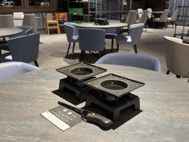 テーブルに注目。各席に固形燃料が備わった卓上コンロがある。一体なにに使うのだろうかと疑問に思うが、その答えはすぐにわかる。