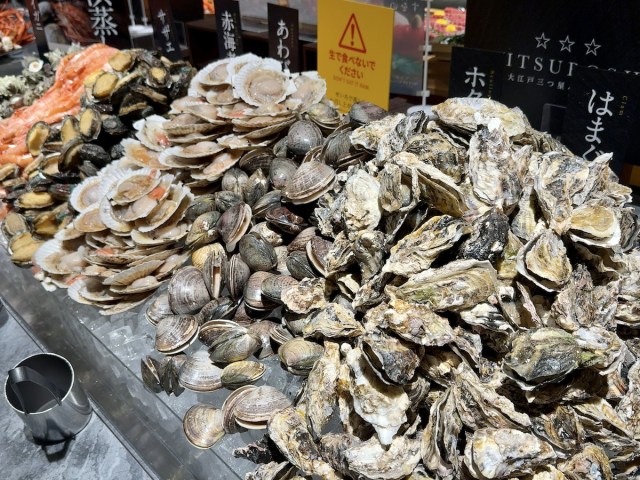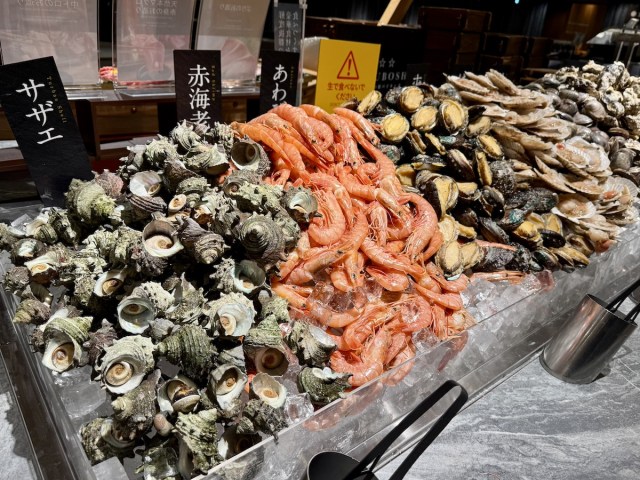 ビュッフェテーブルに山盛りになったサザエ・赤海老・アワビ・ハマグリ・ホタテ・牡蠣! 卓上コンロの目的はこれだ。好みの海鮮を、和せいろで蒸し上げて好きなだけ食べられる。