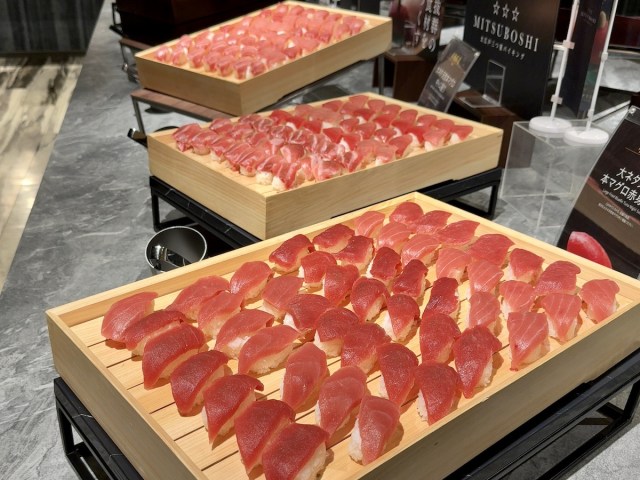 寿司のほうが好みならこちらのコーナーへ。大ネタの中トロ、赤身、真鯛、サーモン、イカ、フグといった鮮魚のほか、玉子や蒸しエビのような定番も並ぶ。
