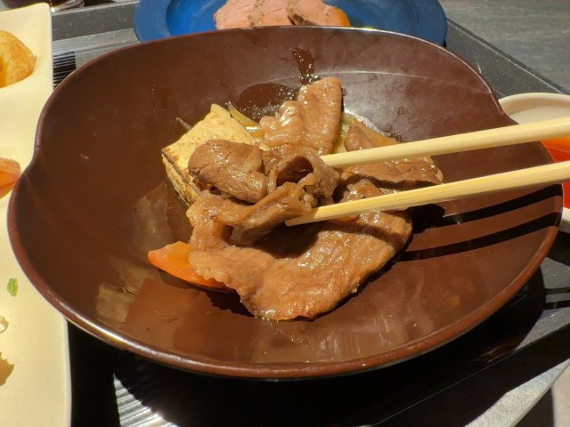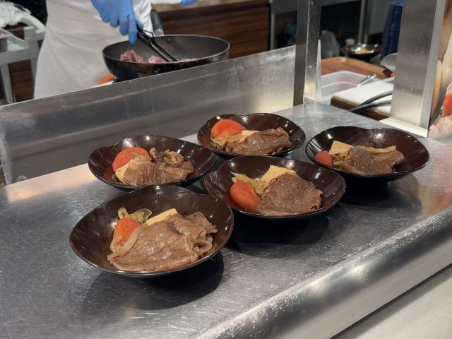 会場の最奥部にはライブキッチンがある。そこで供されていたのは高級食材・黒毛和牛ロースの焼きすきや……