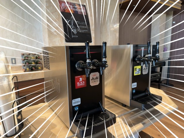 カウンターの端にあるのはなんとアルコールのサーバーだ! これもフリードリンク!? いいの!?