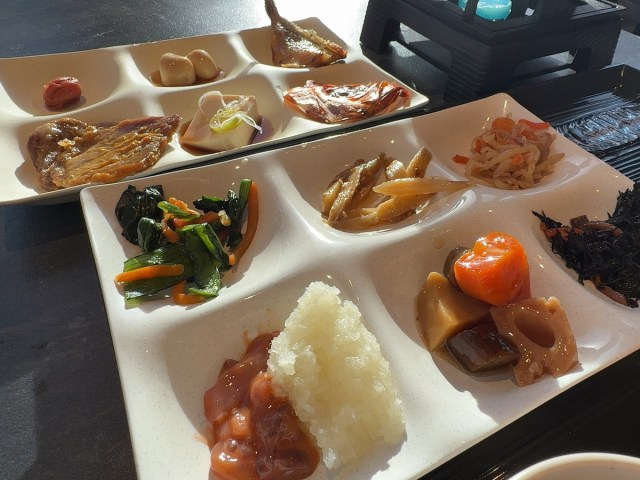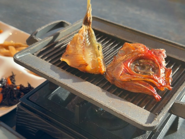 翌日の朝食もバイキングだ。レストランへ向かうと、昨夜とは違う鉄板タイプの卓上コンロが用意されていた。ビュッフェカウンターに並ぶ干物を、自分であぶって食べるという趣向! 朝の瑞々しい光のなか、各テーブルから香ばしい匂いが立ち上る。