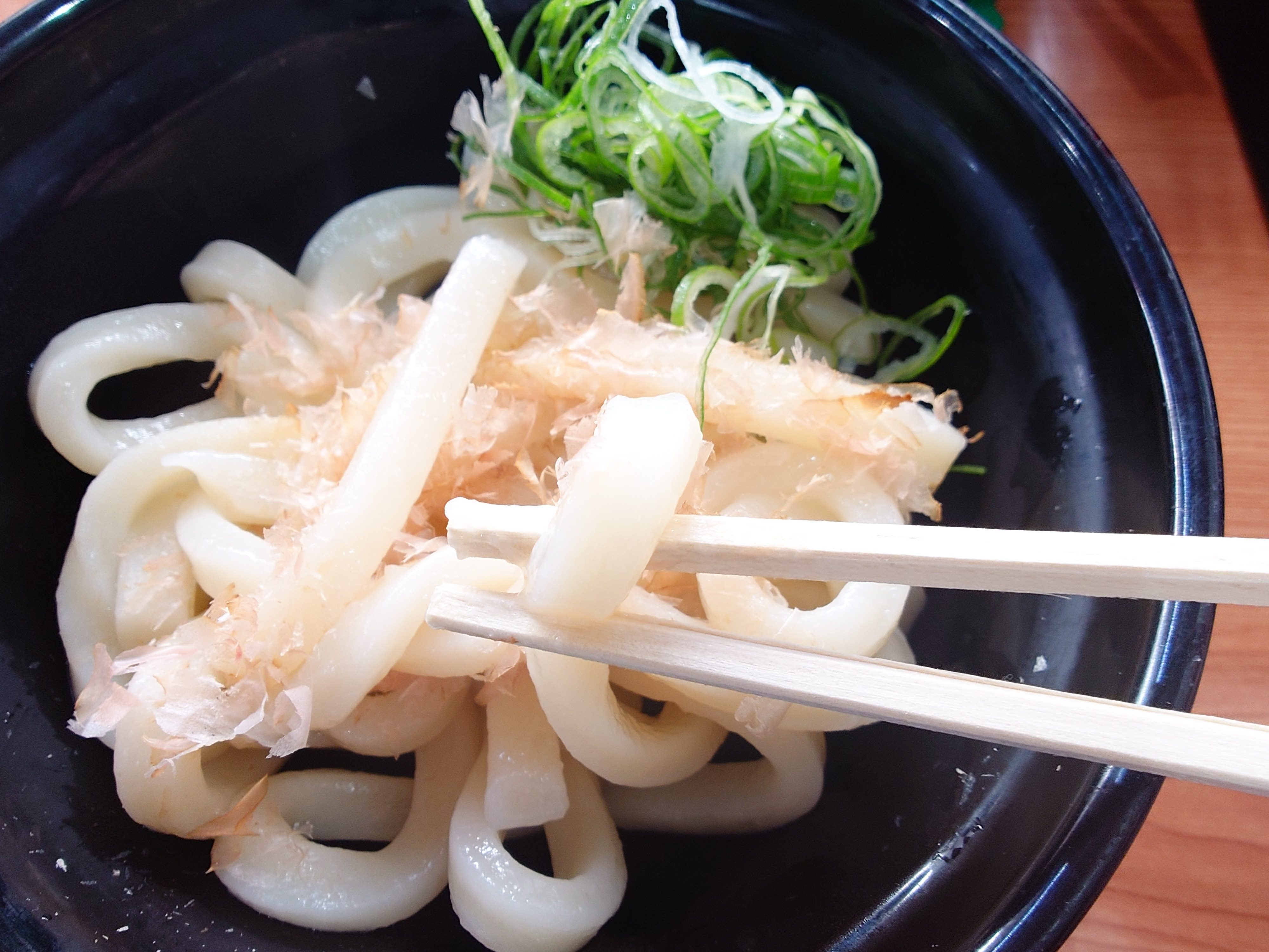 ゴッニュゴニュの歯ごたえで、コシの権化みたいになっている。失敗した太麺にありがちな粉っぽさとかは無く、プルチュルで美味い! ちゃんと讃岐うどんとして美味しい極太麺に仕上がっている。