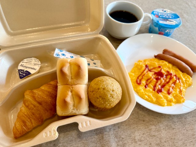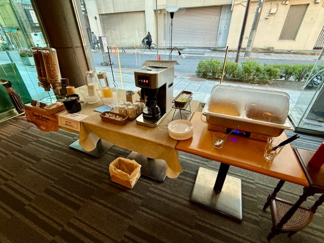 私は1階でパン3種類・ヨーグルト・スクランブルエッグ・ソーセージ・コーヒーをいただいた。シンプルながら満足できる内容。ドリンクが飲み放題なのも嬉しいポイントである。