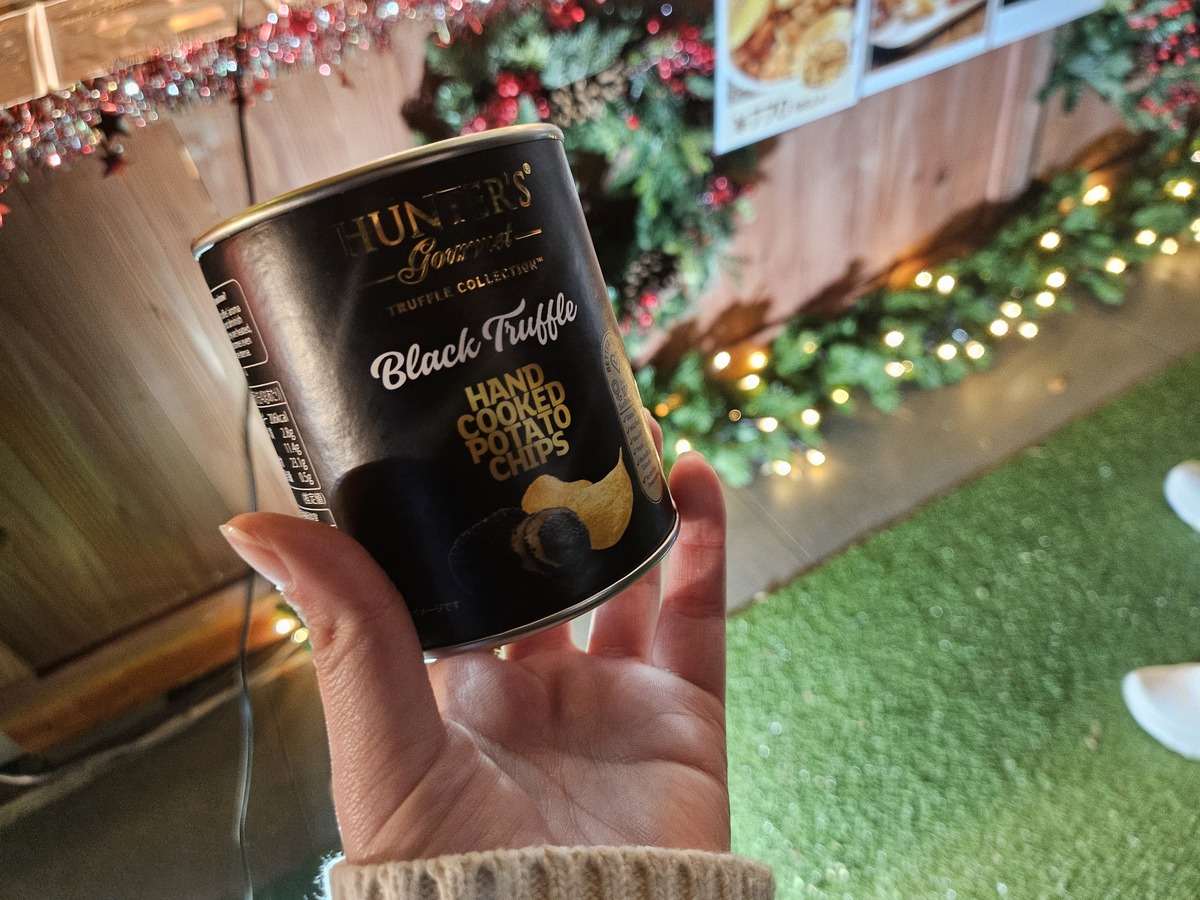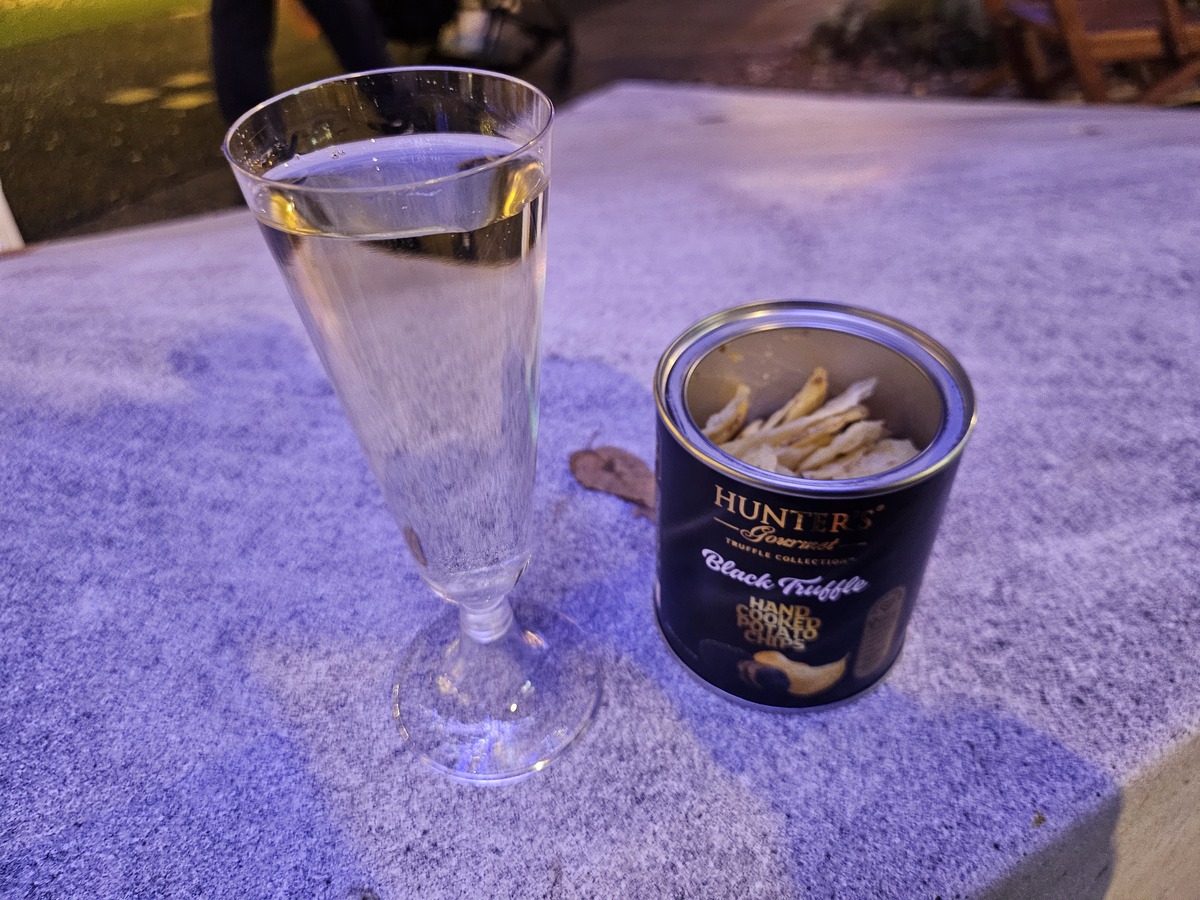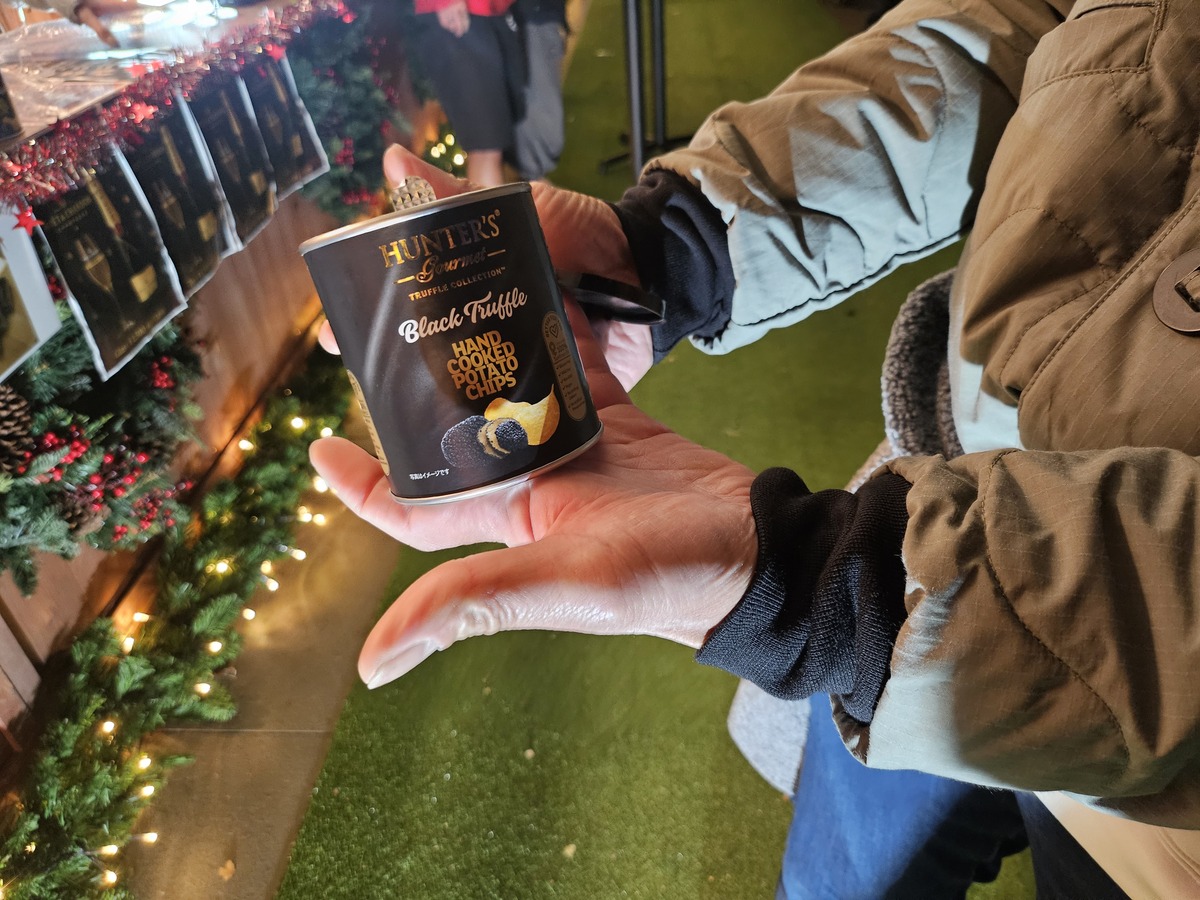 会場にはイートインスペースがあるため、そこで白ワインをひと口。すっきりして飲みやすい。チップスはトリュフ塩味で、香りが強くて贅沢感がある。気付けばワインもチップスも完食していた。