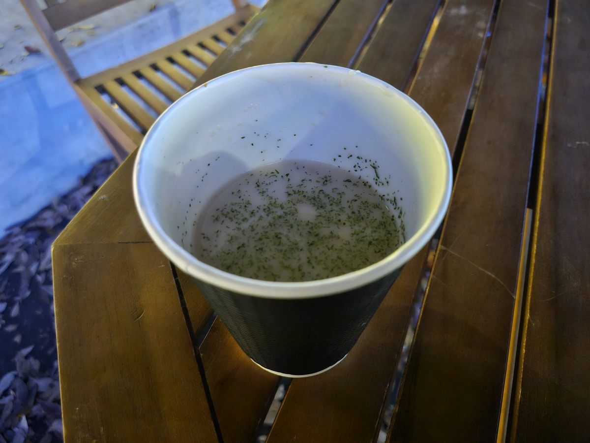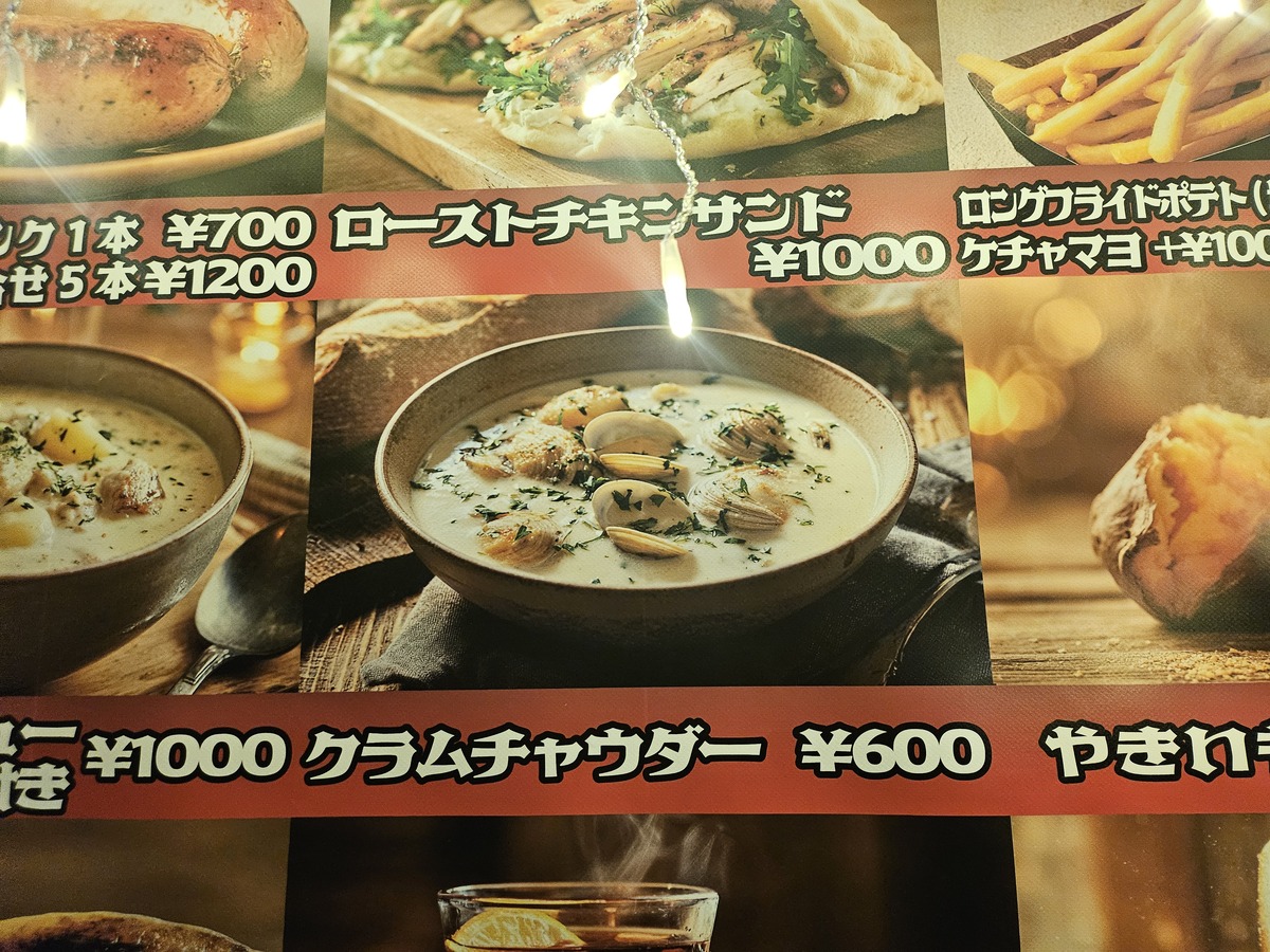 「KOKOROOM」で購入した「クラムチャウダー(600円)」は濃厚で、アサリもたっぷり。冷えた夜に染みる味だった。