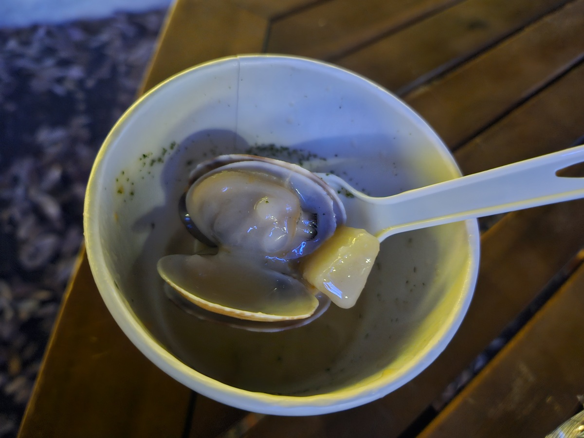 ポテチでお腹はかなり膨れていたが、塩気を求めて会場を歩いているとクラムチャウダーを販売しているヒュッテを発見。