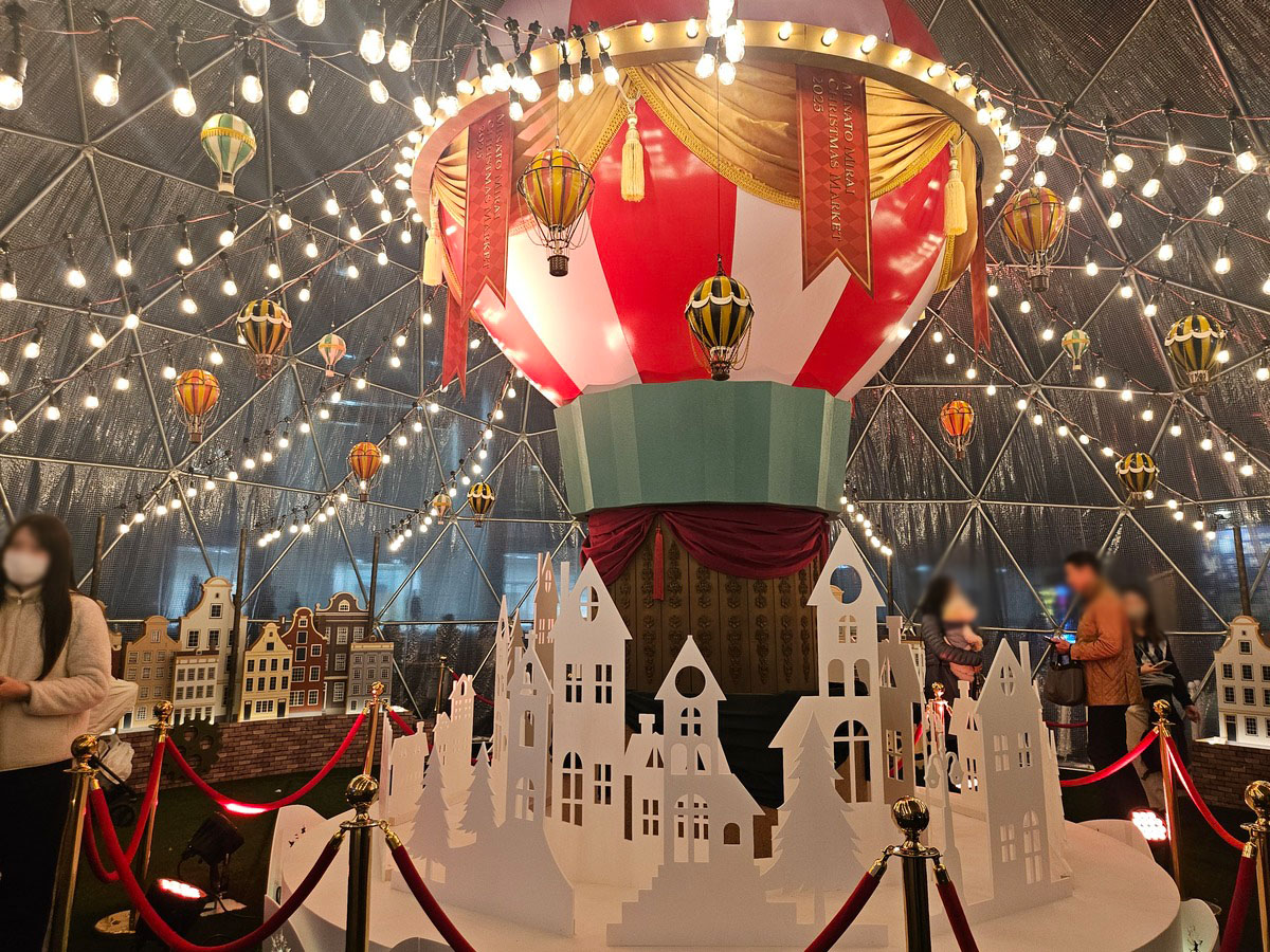 会場中央には巨大なスノードームが鎮座し、その周囲を22店舗のヒュッテが取り囲む構成。会場全体に流れるクリスマスソングも相まって、自然と心が躍った。
