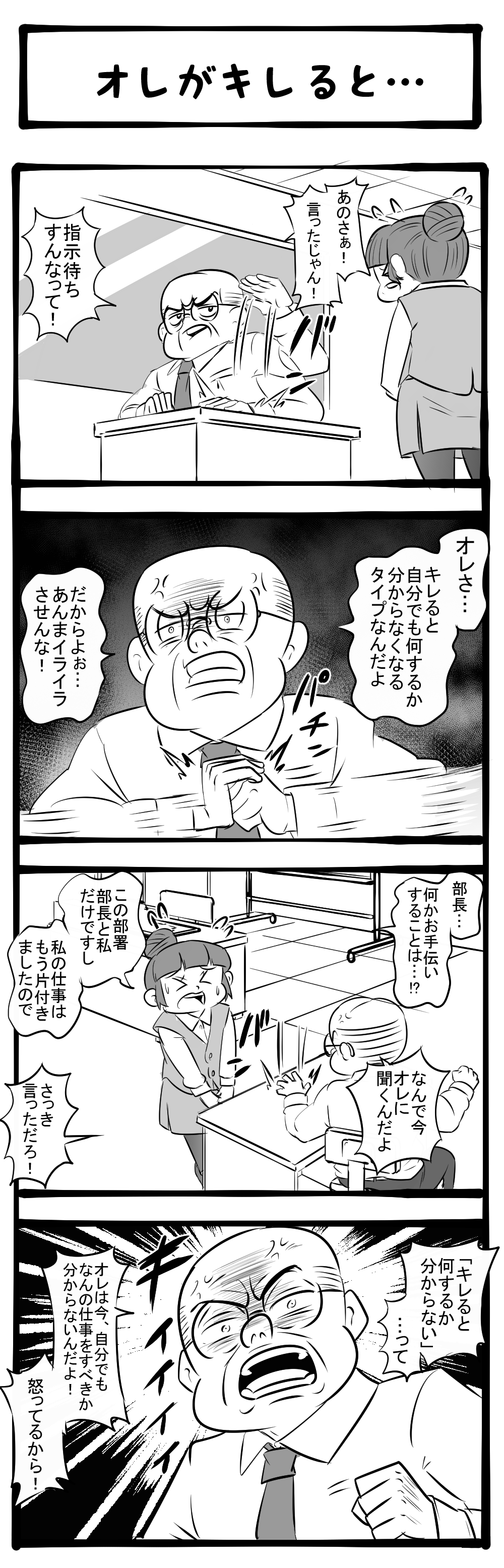 あんまり怒らせるなよ! 威嚇してるように見えて弱点をさらけ出していた上司! 四コマサボタージュBYD第256回「オレがキレると…」
