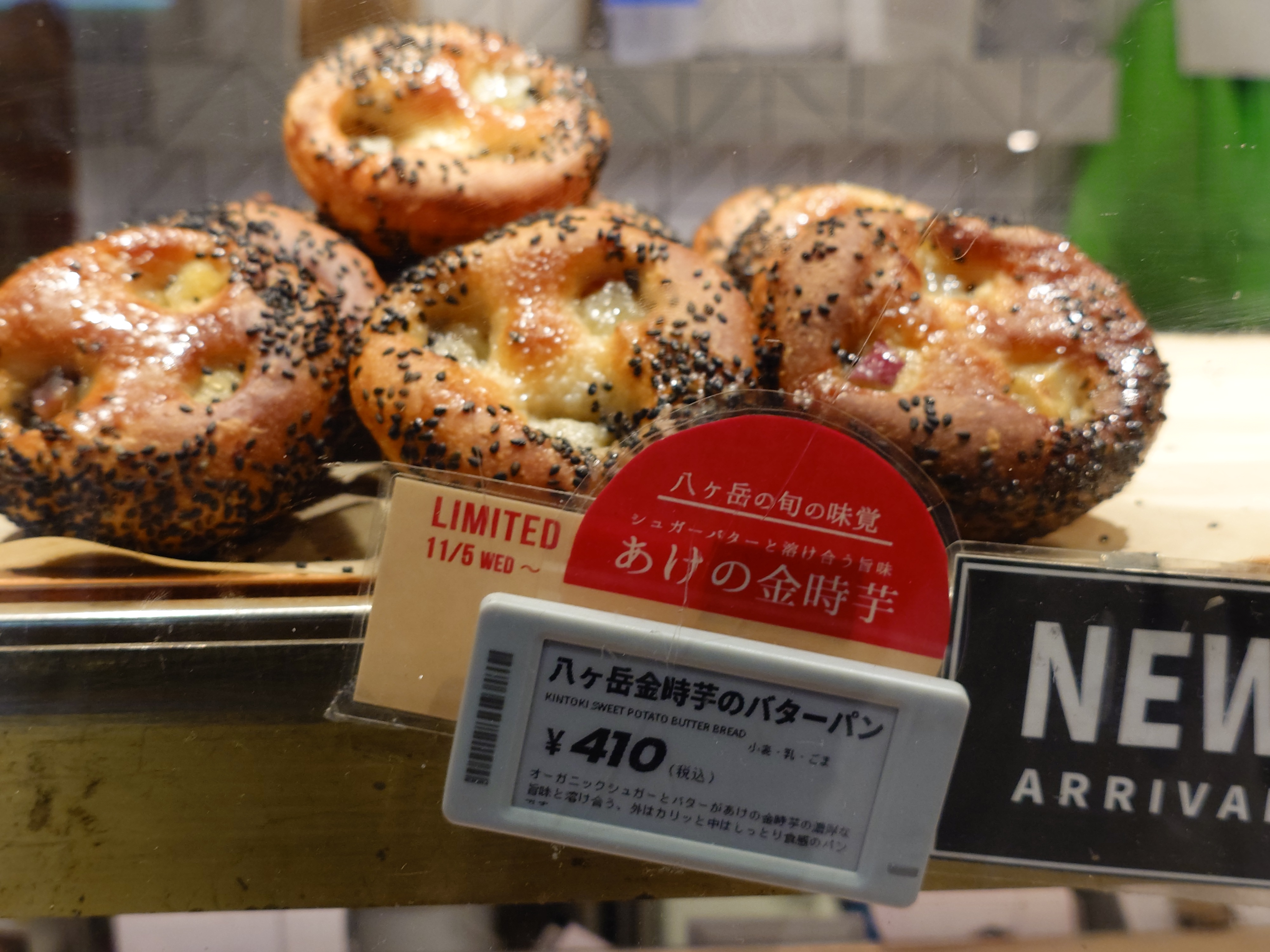 さて、商品ケースを見ると、まず目立っていたのは期間限定らしい「八ヶ岳金時芋のバターパン(410円)」。