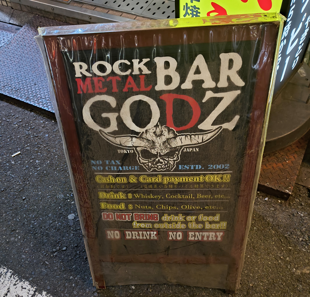 次はMOTHERからすぐのところにあるメタル寄りのお店「GODZ」。どちらのお店もチャージがないから助かるんだよなあ。一応予算は5000円ってことなので、極力お酒に費やしたいところ。