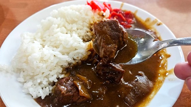 まず……肉デカッ! しかも大量。んで超ホロホロで柔らかい! カレー単体で考えても滅茶苦茶レベルが高いぞ。ここ最近でNO.1美味いカレーかも。